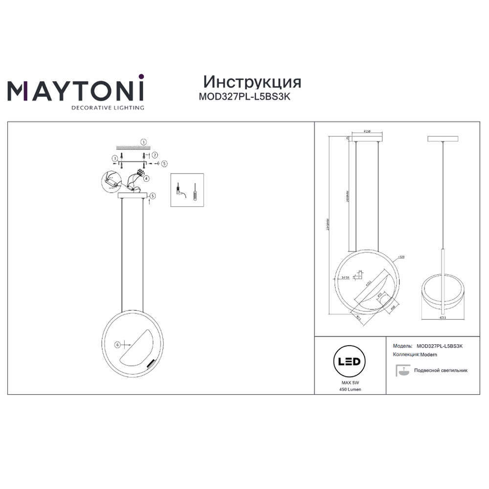 LED пендел Maytoni Lunare MOD327PL-L5BS3K - дизайнерско осветително тяло на немската фирма Maytoni изработено с внимание към всеки детайл. Металната рамка в цвят месинг и прозрачните стъклени елементи идеално ще допълват всеки модерен интериор. Използвайки интегриран LED, тялото свети в мека топла 3000К светлина. Пенделът може да се се регулира по височина.