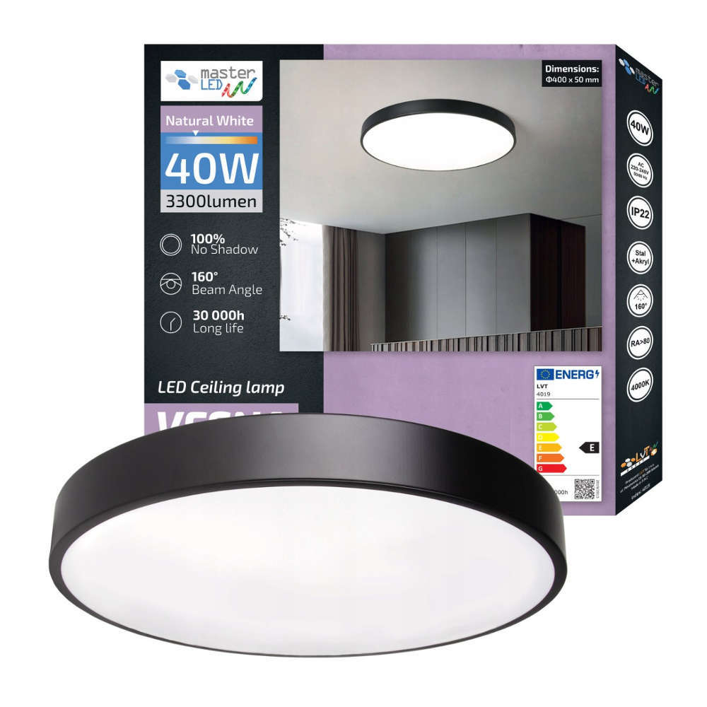 LED плафон LVT 4019 Vesna 220V 40W 3300lm 4000K 160° - кръгъл 40W LED плафон в модерен корпус с диаметър 40см боядисан в черен цвят. Повърхностният му монтаж позволява инсталиране на всеки тип таван. Осветителното тяло е оборудвано с вграден LED източник. Благодарение на това решение излъчва еднаква светлина върху цялата светеща повърхност. Използваните светодиоди позволяват висок светлинен поток от 3300lm, което е еквивалент на традиционна 200W крушка. Характеризират се и с висок индекс на цветопредаване Ra> 80. Тази LED таванна лампа е подходяща за домашни и търговски приложения.