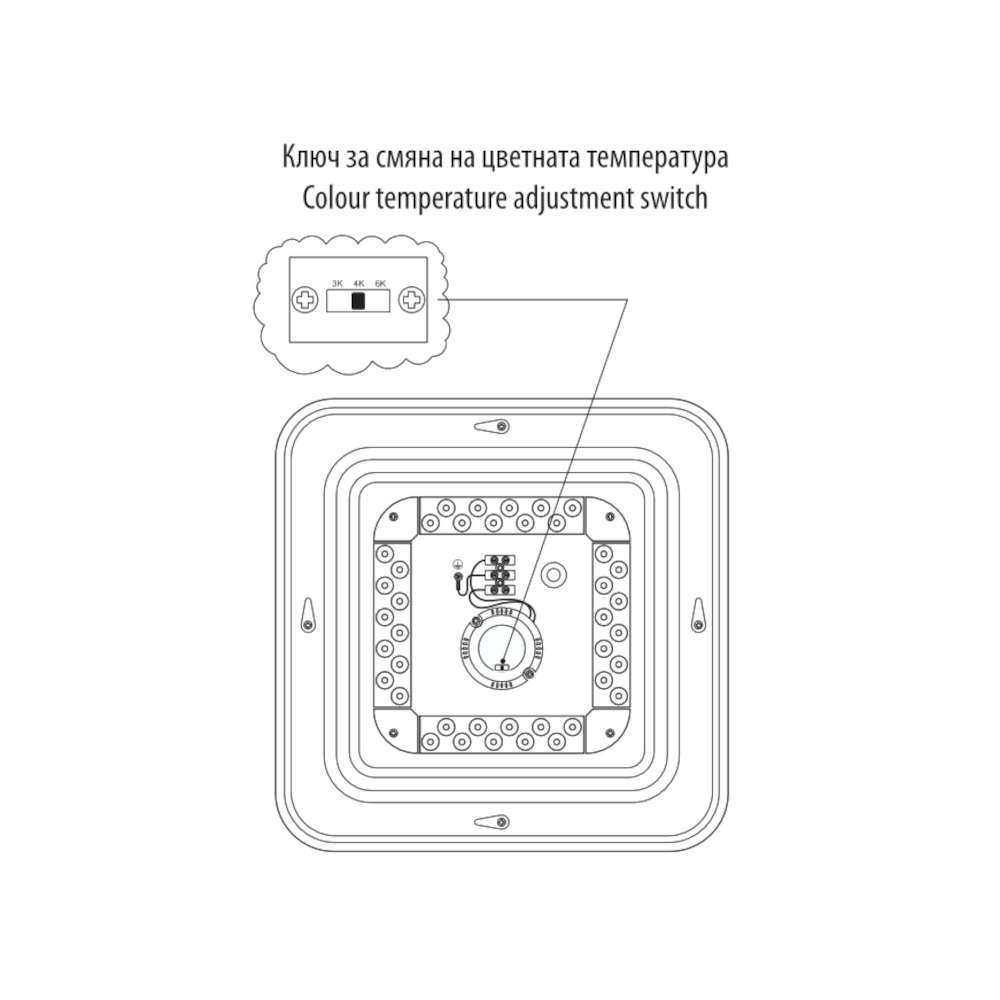 Осветителното тяло разполага с вграден превключвател за избор на цветна температура – 3000K, 4000K или 6500K, което позволява лесно адаптиране към различни приложения – уютна, неутрална или функционална светлина.
