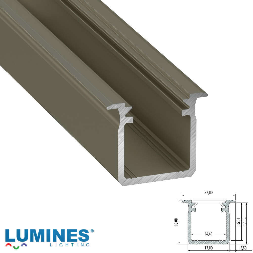 LED профил за вграждане Lumines G 10-0073-30 с дължина 3 метра, изработен от висококачествен алуминий с елегантно INOX (бронз) покритие. Проектиран за професионален монтаж на LED ленти в тавани, стени и мебели, профилът осигурява ефективно охлаждане, дълъг живот на осветлението и чист, архитектурен вид. Идеално решение за жилищни и търговски интериори. Луксозен мебелен профил за вграждане, за лед ленти и модули с широчина до 14 мм.