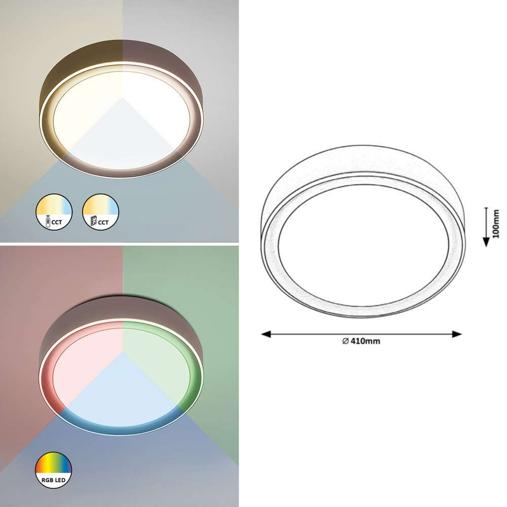 LED плафон Rabalux Mokka 2987 е елегантно осветително тяло за монтаж на таван, изработено в кафяво и бяло. Металното тяло на Mokka е допълнено от акрилен абажур и вграден LED източник на светлина. С кръглата си форма Mokka ще бъде чудесен избор за вашата модерна всекидневна, спалня или кабинет. Този модел в минималистичен стил радва потребителя с множество полезни и приятни функции. Интелигентната лампа е с мощност 24 W, светлинен поток от 2000 лумена и продължителност на живота от 30 000 часа, защитена от пет годишна гаранция. LED плафонът е димируем, т.е. яркостта може да се променя по желание с помощта на дистанционно управление. Цветната температура също може да се регулира между 3000–6000K с помощта на стенен превключвател или дистанционно управление. Можете също така да зададете RGB осветление, което означава, че можете да промените цветовете. Допълнителните екстри включват функция за памет, която може да се управлява чрез дистанционно управление или стенен превключвател, както и таймер и функция за нощна светлина. Диаметърът на таванната лампа Mokka е 410 мм, разстоянието от тавана е 100 мм.