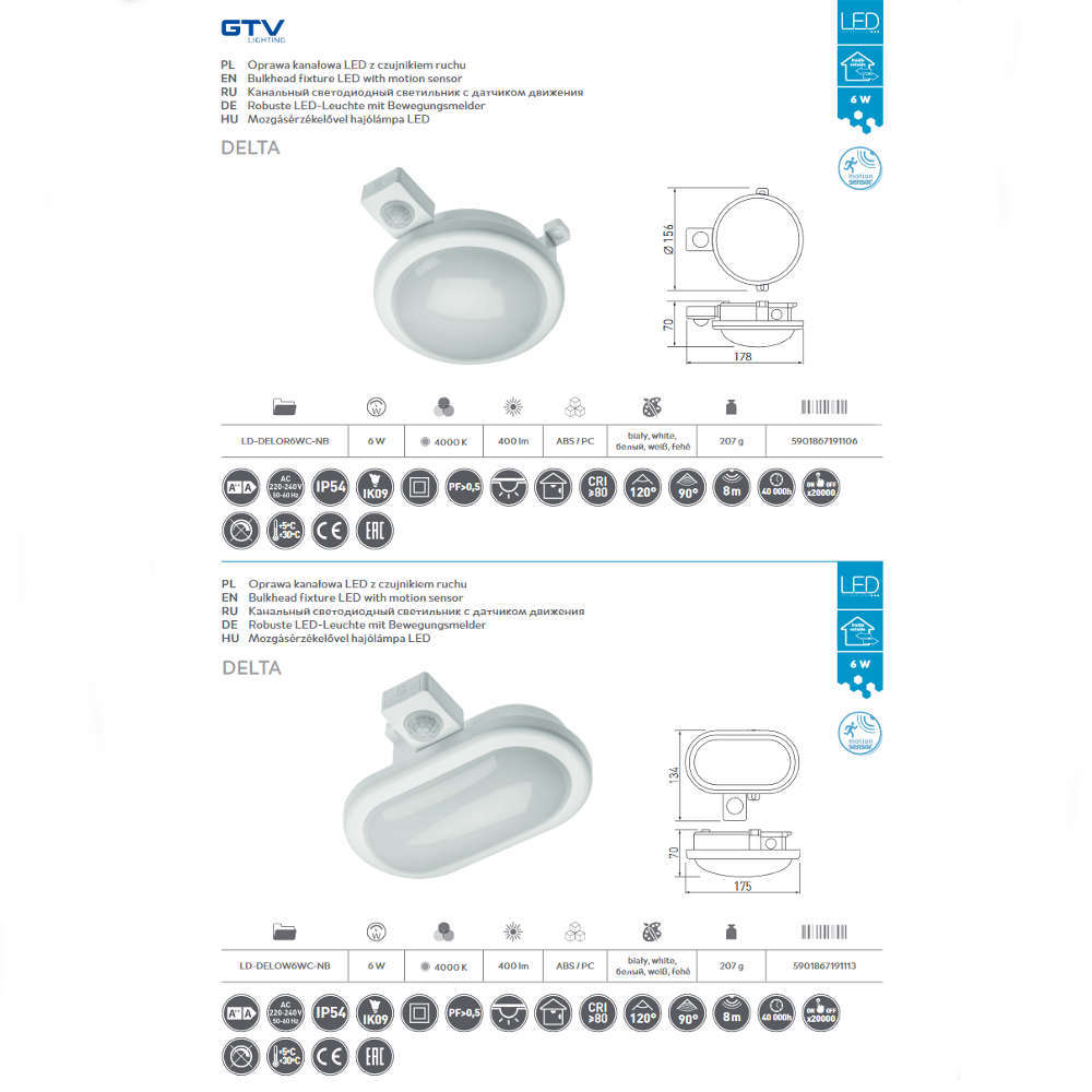 LED осветително тяло със сензор за движение GTV DELTA OR LD-DELOR6WC-NB , 220V, 4000K, 6W, 400lm, IK08, IP54