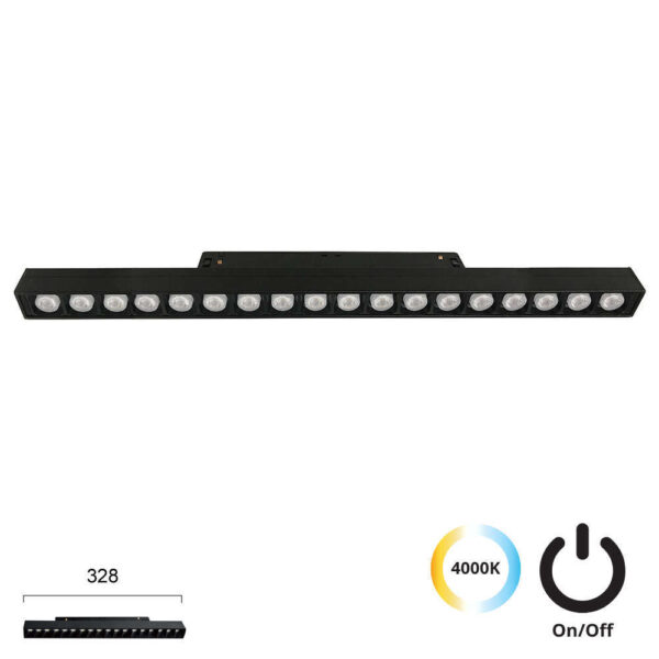 Изработен от електростатично боядисан алуминий в стилен черен матиран цвят, този прожектор е предназначен за монтаж върху 48VDC магнитни релсови системи Viokef. Компактните му размери (L:328mm, H:45mm, W:22mm) позволяват гъвкава интеграция в различни осветителни концепции. С насочен светлинен поток от 24° той съчетава функционалност и модерен дизайн, предлагайки ефективно и стилно осветление.