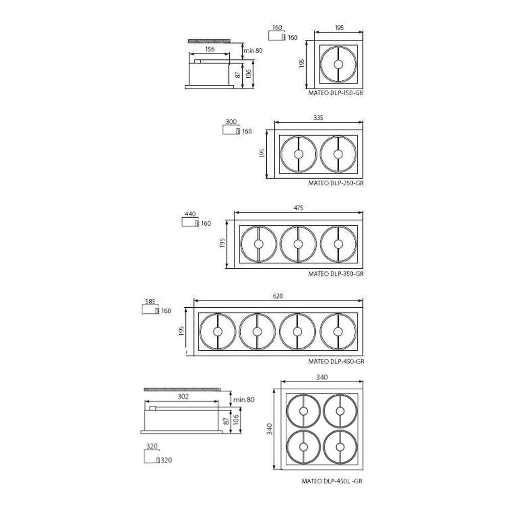 Четворна карданна луна за вграждане Kanlux MATEO DLP-450-GR- осветително тяло за вграждане използващо за светлинен източник лампа AR111. Карданна луна за 4 лампи AR111 с ротация на тялото 25° спомагащо за прецизно насочване на светлината с приложения за акценто и основно осветление в магазини, търговски обекти, банкови учреждения, безиностанции. Карданна система модел MATEO DLP-450-GR е съвместима с всички модели лампи AR111. За да бъде съчетано вашето карданно осветление изберете единични, двойни или тройни карданни ситеми Kanlux MATEO DLP.