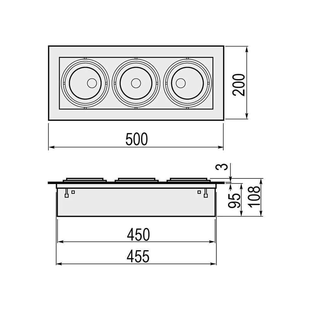Тройна луна кардан за вграждане GTV OP-PIREO3-81- осветително тяло за вграждане използващо за светлинен източник лампа AR111. Карданна луна за 3 лампи AR111 с ротация на тялото 25° спомагащо за прецизно насочване на светлината с приложения за акценто и основно осветление в магазини, търговски обекти, банкови учреждения, безиностанции. Карданна система модел OP-PIREO3-81 е съвместима с всички модели лампи AR111. За да бъде съчетано вашето карданно осветление изберете единични, двойни или четворни карданни ситеми GTV Pireo.