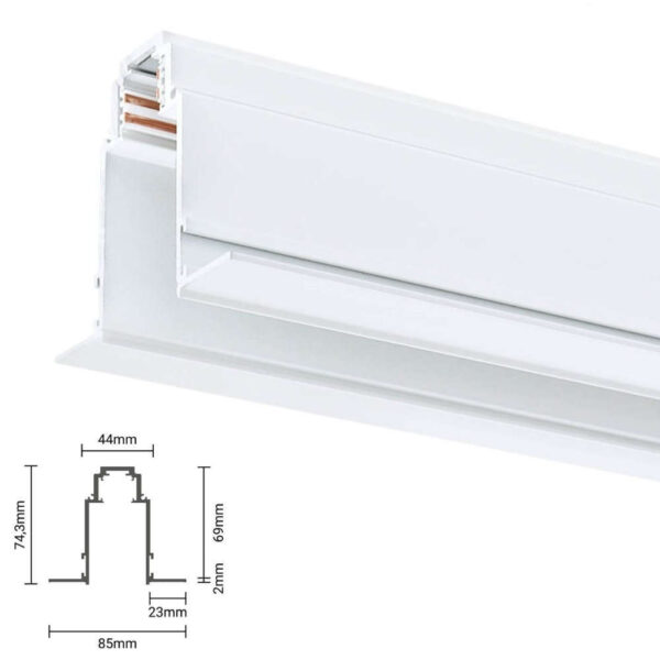 Магнитна шина за вграждане, материал алуминий, бяла, дължина 2 метра, Optonica 5252 е предвидена за директен монтаж върху гипсокартон при предварително оставен улей за потъване на шината и изградена конструкция за укрепването и. След изграждане на магнитната конфигурация лесно можете да позиционирате различните осветителни тела - прожектори, спотове, пендели, линейни осветителни тела. Магнитното осветление идеално се вписва в минималистичен и съвременен дизайн. Това е предпочитано решение за осветление, предлагащо бързи настройки и елегантна естетика.