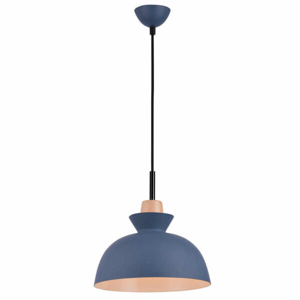 Zambelis 180067 е прахово боядисана алуминиева висяща лампа в наситен матово син цвят на основата и външната страна на рефлектора, бяла матова вътрешна част и дървен декоративен елемент. Широкият абажур и кабелът, който може да бъде скъсен в точката на монтаж, добавят характерност и правят пендела чудесно осветително тяло за над маси, кухненски острови, детски стаи, плотове и др., дори и в помещения с по-ниски тавани.