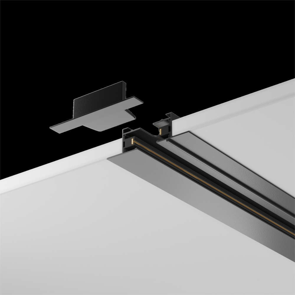 Релса за вграждане за релсово осветление 220V, алуминий, черна, включена тапа и захранващ модул