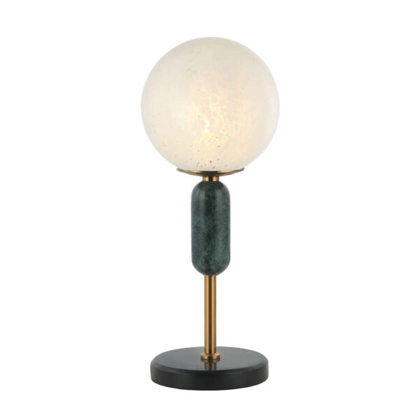 Настолна лампа Viokef Luciano 4264300 с фасунга E27, съчетаваща метал в черно и месинг, зелен мрамор и стъклен абажур. Елегантен дизайн с геометрични линии и луксозно излъчване. Подходяща за хол, спалня и кабинет като декоративно и функционално осветление.