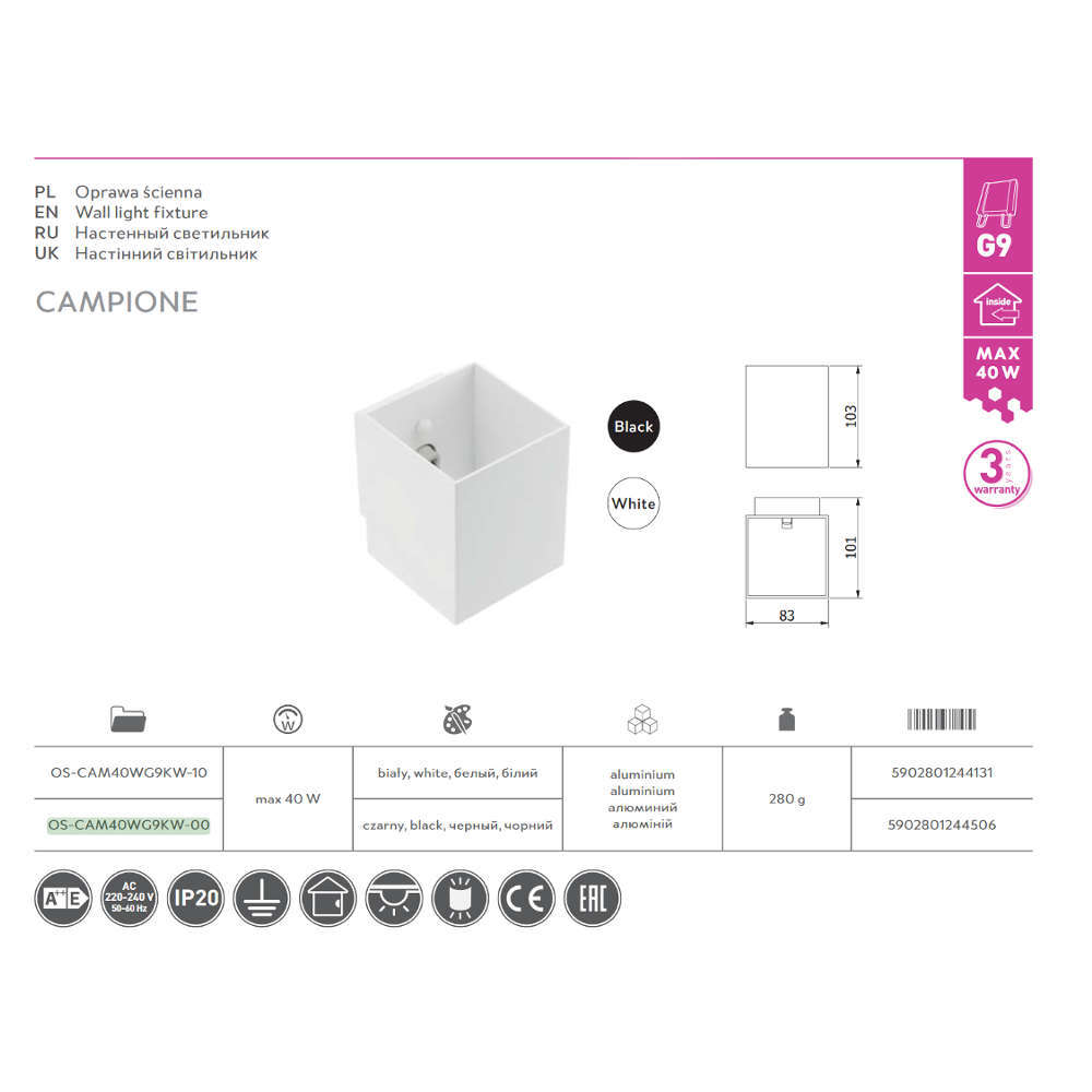 Параметри на осветително тяло за стена GTV OS-CAM40WG9KW-00: