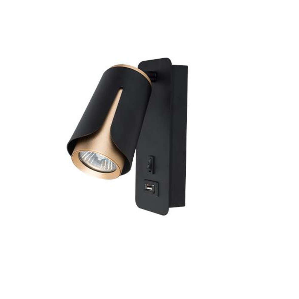 Аплик за стена с ключ и USB, фасунга GU10, цвят черен мат и матирано злато