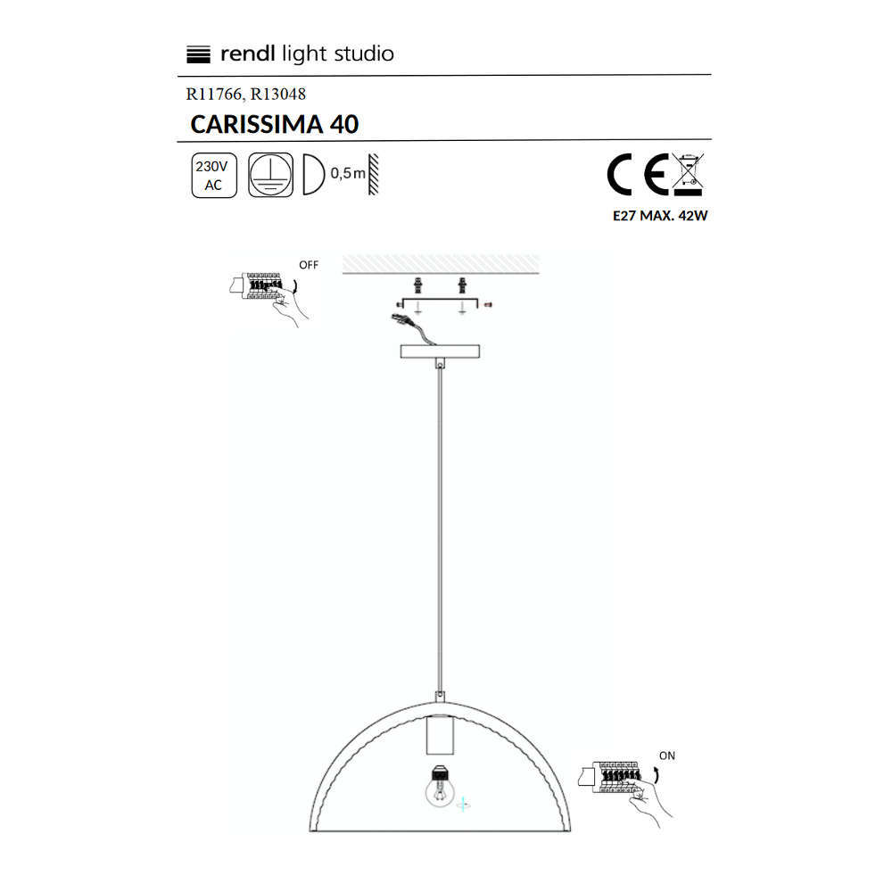Пендел Rendl Light Studio CARISSIMA 40 R13048 - осветително тяло вписващо се в класическите и съвременните дизайнерски тенденции, освежаващи осветителни форми с безкомпромисно изработени детайли. Това висящо осветително тяло внася изискана красота и минимализъм в заведения, жилищни и търговски помещения. Пендел Rendl Light Studio CARISSIMA 40 R13048 внася елегантно осветление както в интериора, така и в екстериора на местата за хранене и забавление. Серията пендели Пендел Rendl Light Studio CARISSIMA 40 R13048 се предлагат и в черен цвят.