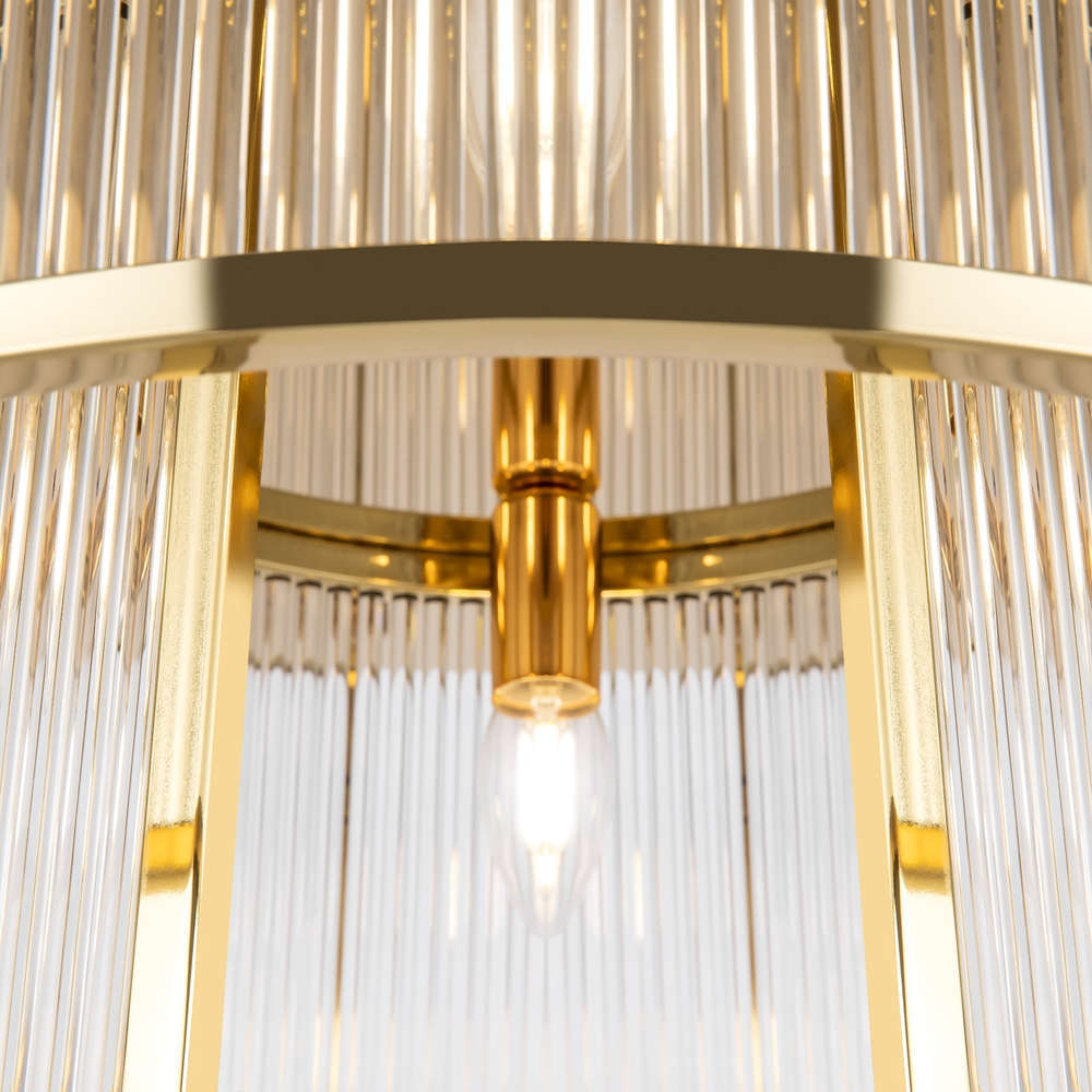 Луксозна плафониера с 6 фасунги Е14, тяло от стъклени тръби и метален корпус в цвят злато