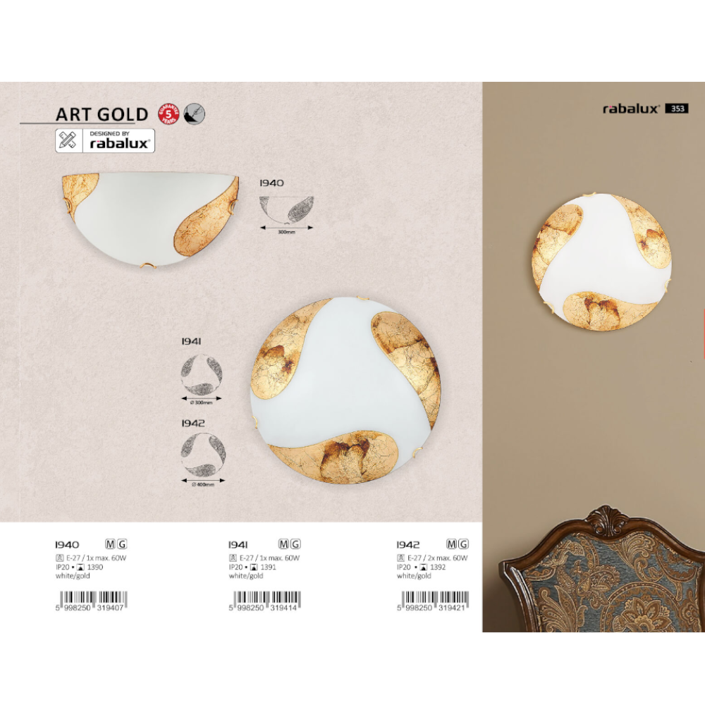 Плафон Rabalux ArtGold 1942 - оригинален плафон за вашето осветление изработен от метал и стъкло. Инсталирани в тялото две фасунги Е27. Красивата визия на плафона се допълва от ръчно изрисувани мотиви. Серията Art Gold Rabalux се допълва от по-малък плафон и стенен аплик.