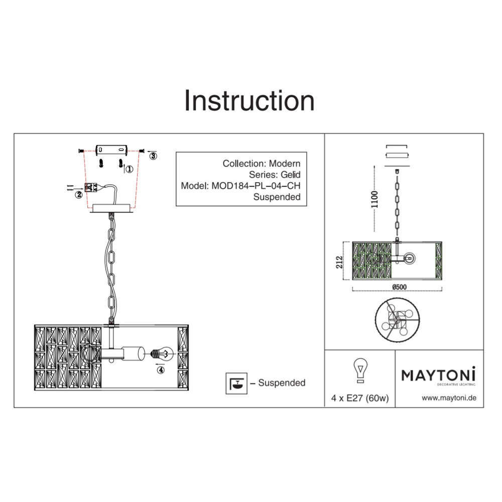 Кристален полилей с 4 фасунги Е27, ф500x1312, хром и кристал