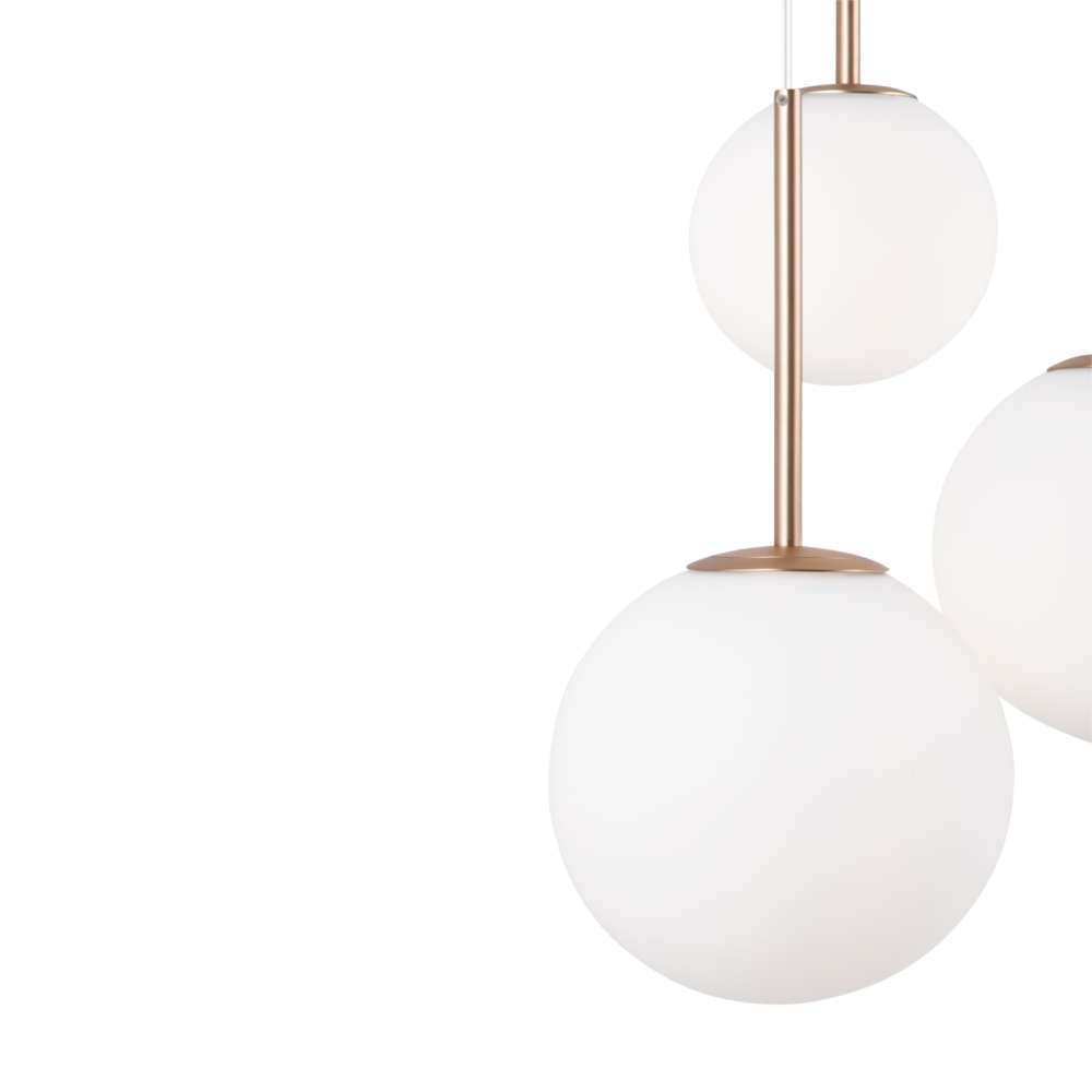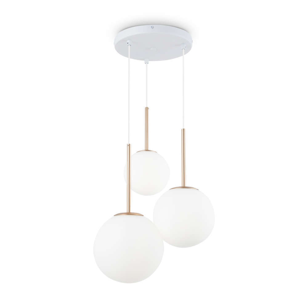 Полилей Maytoni MOD321PL-03G - висяща лампа серия Basic form от немската фабрика Maytoni която ще добави финес и модерен стил в хола, дневната, коридора, спалнята, кабинета. Изработен от метал, бял цвят и месинг мотиви и 3 стъклени абажура с цокъл 3хЕ14 с допустима мощност на лампите 3x60W. Висящите абажури подлежат на регулиране по височина. Серията осветителни тела Maytoni Basic form се допълват от единични и тела с пет абажура, допълнени с черни или месинг мотиви.