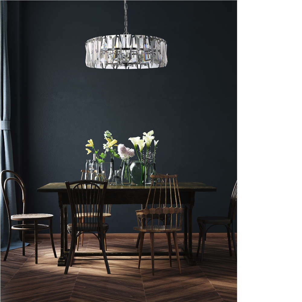 Луксозен кристален полилей в цвят хром, 6 фасунги Е14, регулиране на височината