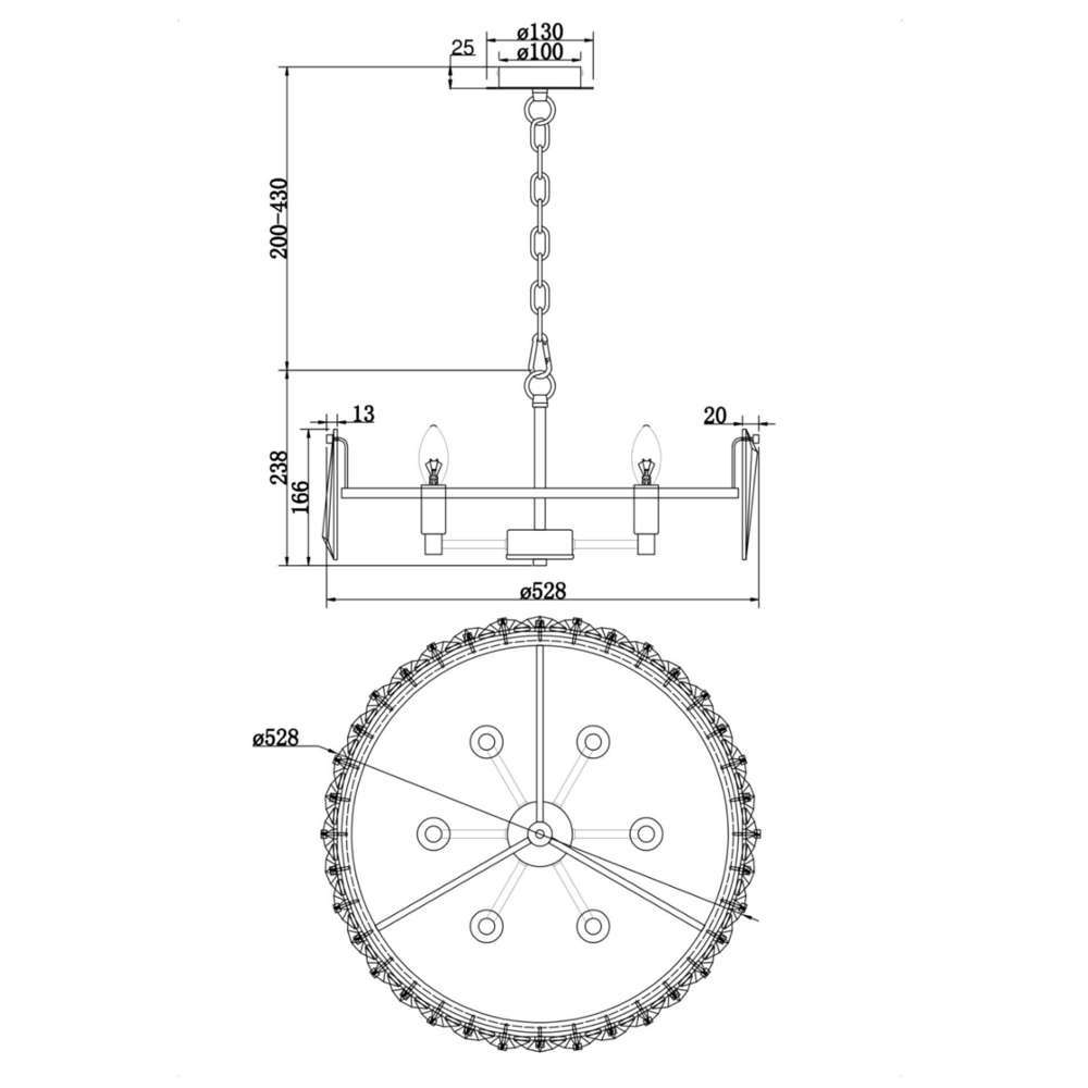 Представяме ви полилей Puntes от Maytoni, зашеметяващо допълнение към всяка стая във вашия дом, офис или хотел. Този елегантен полилей е част от серията Puntes, която включва 4 модела, като този е вторият най-малък от колекцията, правейки го идеален за тези с по-малки пространства. Изработен е от красиво стъкло и здрава метална рамка, което му придава класически, но и модерен вид. Орнаментите са изработени от стъклени плочки, които придават фина, но изтънчена нотка на цялостния дизайн. Полилеят е с регулируема височина, с минимална такава от 438 мм. и максимална височина от 668 мм., което ви дава възможноста да го персонализирате, така че пасне на вашето пространство. Осветителното тяло е проектирано да използва до 6 крушки съвместим с фасунги E14. С диаметър от 517 мм, той е идеалният размер, за да направите впечатление във всяка стая. Розетката, с която се захваща към тавана е с височина от 25 мм. и диаметър 100 мм. Полилеят Puntes на Maytoni се предлага с 3-годишна гаранция и с тегло от 6.86 кг.. Добавете нотка елегантност и изтънченост към дома си с полилея Puntes от Maytoni.