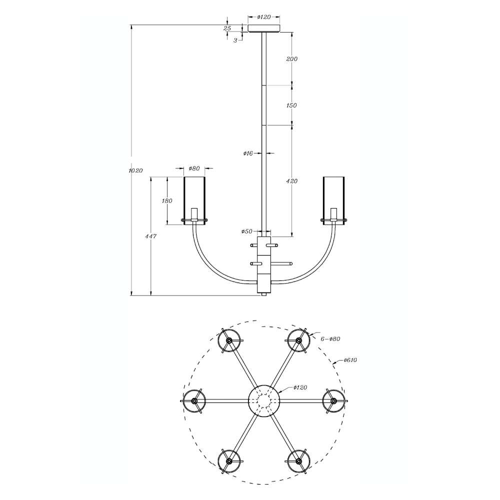 Полилей Maytoni Arco MOD223PL-06BS с геометрична метална конструкция в месингов цвят, шест рамена със стъклени абажури с вертикална текстура, създаден за равномерно основно осветление с изразен декоративен ефект.