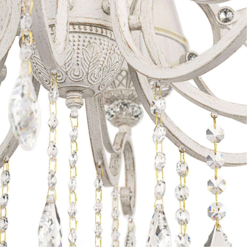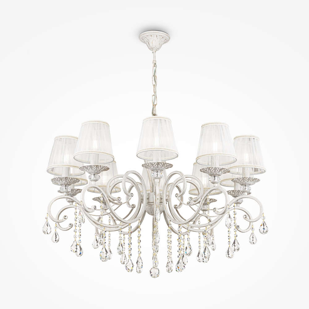 Голям класически полилей Maytoni Grace ARM247-10-G с орнаментирана метална конструкция в бял финиш, абажури от органза и кристални висулки, предназначен за основно осветление в просторни помещения.