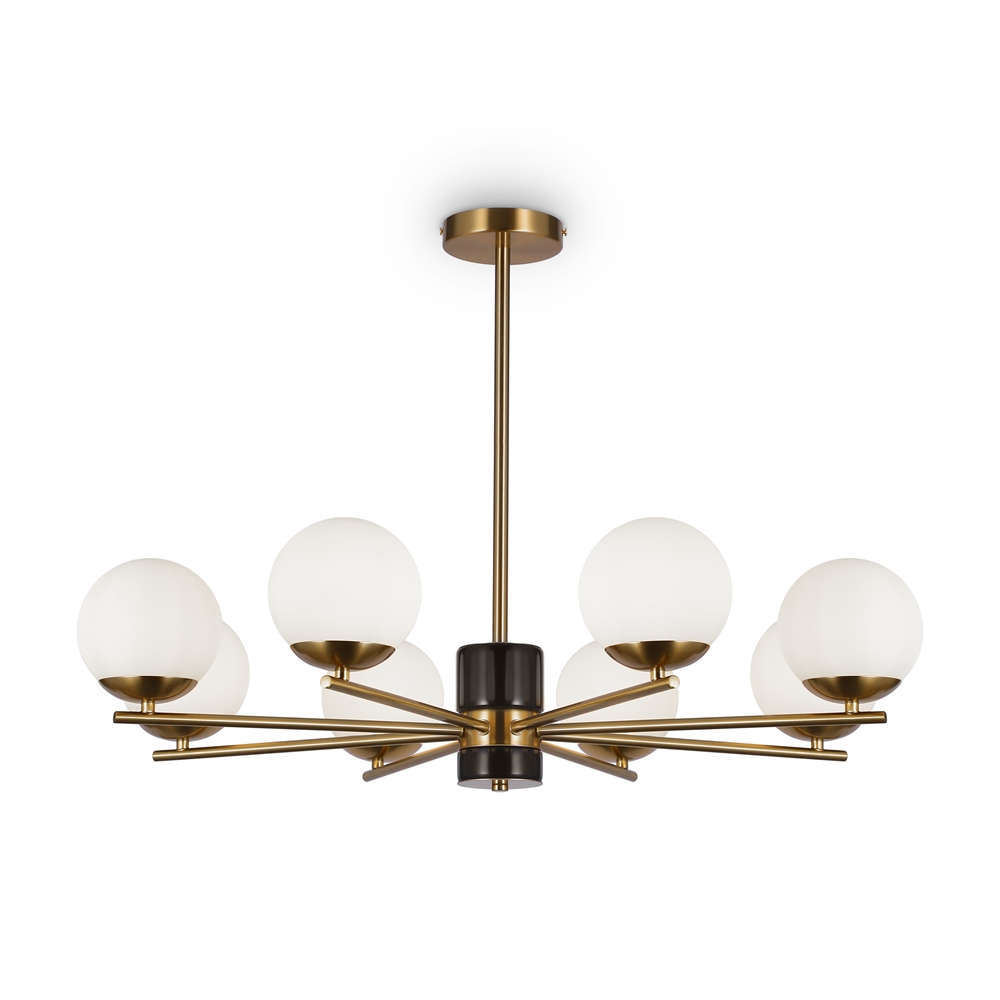 Полилей Maytoni Marble MOD187PL-08BS е модерно осветително тяло с прави линии и сфери - тези геометрични елементи определят вида на висящото осветително тяло Marble с осем бели абажура и с цветовете матово злато/месинг, черно и бяло, му придават модерна елегантност, която може да се интегрира в много интериорни приложения за осветление за дома, офиса или бизнеса. Изнесените носещи елемента с осем стъклени абажура са прикрепени към носещия в средата основа, дискретно закрепена към кръгла розетка. Използвайки модерния полилей от метал и стъкло Maytoni Marble MOD187PL-08BS ще постигнете ярко осветление на помещението, а също ще привлича вниманието дори, когато не свети.
