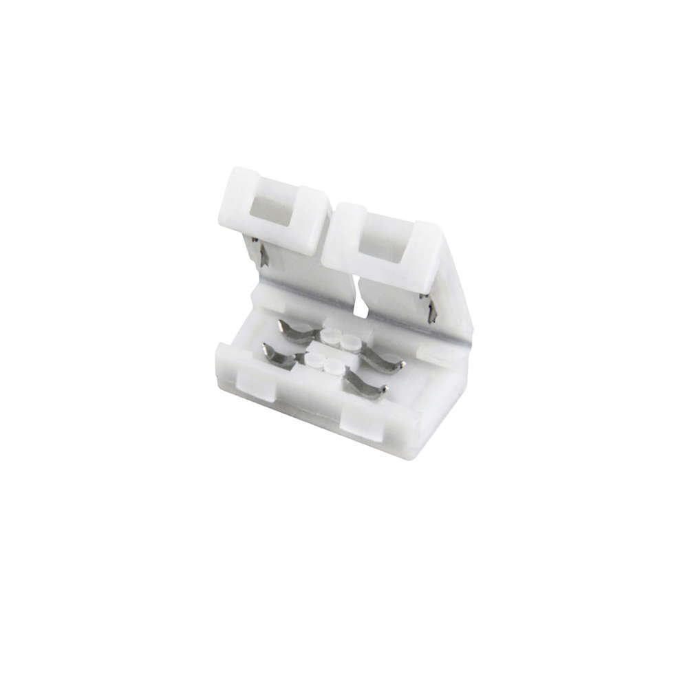 Прав конектор за удължаване на едноцветни LED ленти с широчина 10 мм LVT-4455. Конекторът е двупинов, с размери 15x14x5 мм и улеснява свързването на лентите.