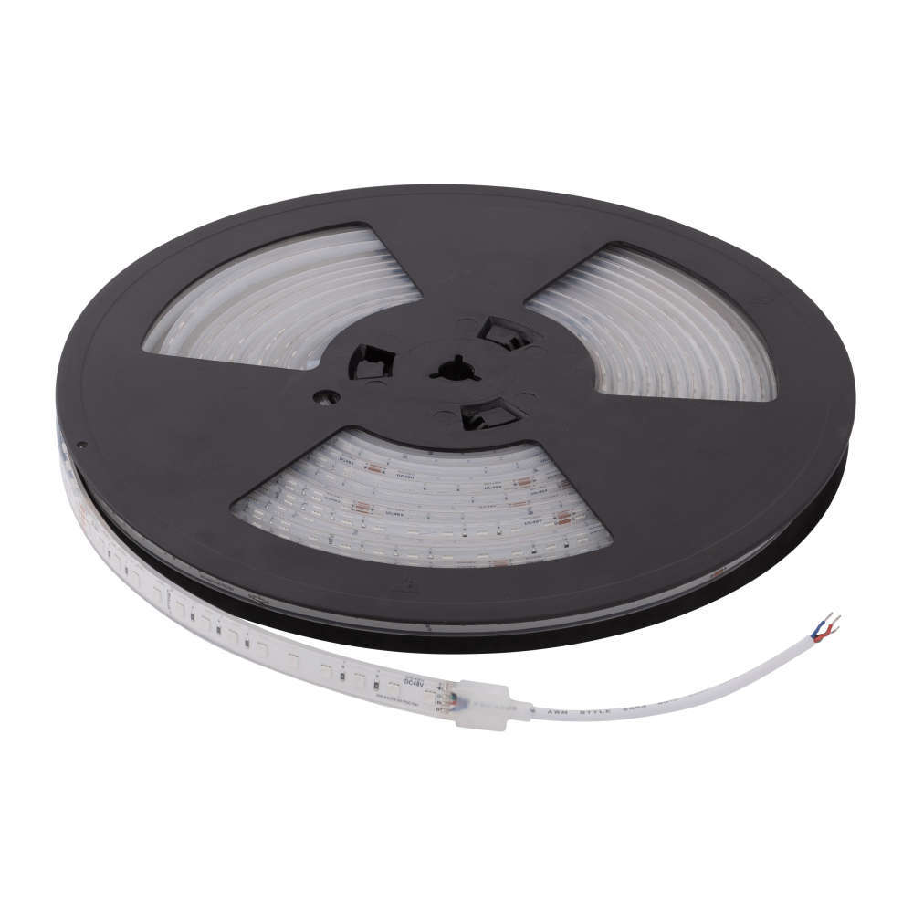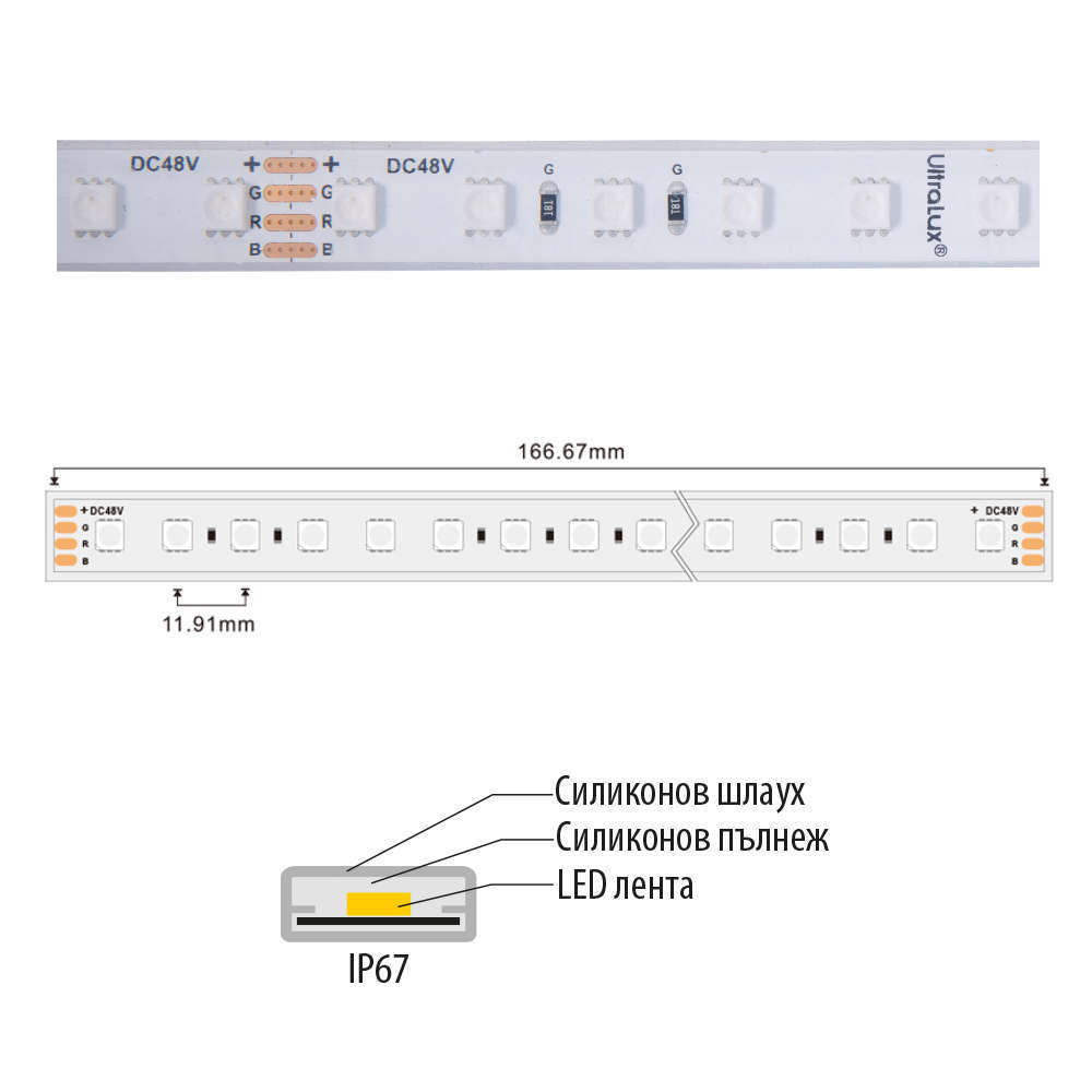 Водоустойчива професионална RGB LED лента 48VDC - Ultralux PS408467RGB LED лента за професинално приложение с работно напрежение 48VDC. Подходяща за директен монтаж във влажни зони или инсталиране в алуминиеви led профили. Мощна професионална RGB LED лента с 36 месеца гаранция. Стандартната дължина на лентата е 10m при работно напрежение 48V DC. За осигуряване степен на защита IP67 е използван екструдиран силиконов шлаух, запълнен с гел. За бързо и лесно свързване на летите, UltraLux предлага и комплект водоустойчиви IP67 мъжка и женска букси със заключване PKFM67RGB. Водоустойчивата професионална RGB LED лента позволява да бъде захранена едностранно на всеки 20m, което я прави приложима за фасадно осветление, рекламно и ефектно осветление в дома, офиси, магазини, хотели, казина и др. Включва 35 бр. силиконови крепежни скоби, 20 бр. силиконови тапи.