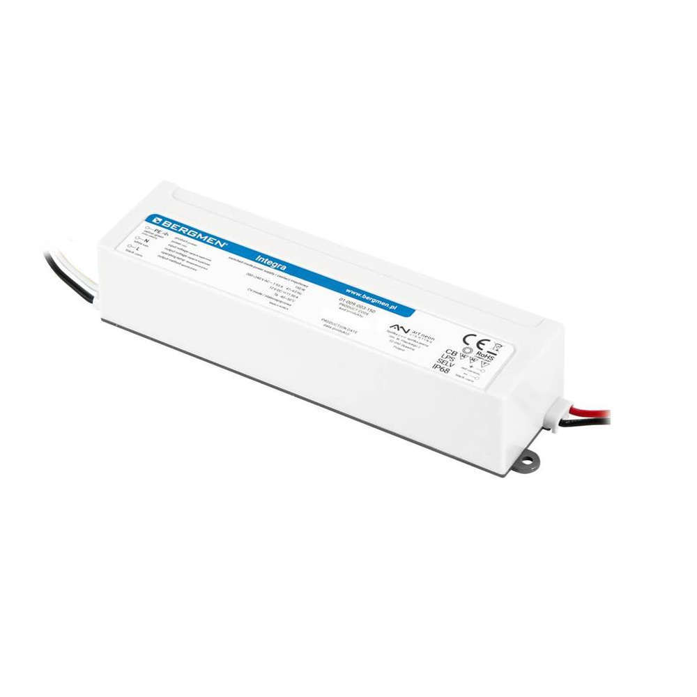 Захранване за LED ленти и LED модули BERGMEN Integra 3012 30W 2.5A 12VDC IP68 с артикулен номер 01-009-003-30. Integra 3012 е компактно професионално LED захранване със слим дизайн с размери 151.5x35.5x25.5 mm от професионалната серия Integra стабилизирани захранвания по напрежение, произведено в Корея, подходящо за високо натоварване и с висока степен на защита IP68. Високата степен на защита IP68 позволява използването му във влажни условия. Захранването работи стабилно в широк температурен диапазон от -40 до +70°C и е изключително подходящо за използване в рекламната индустрия в светещи табели, обемни букви, билбордове, както и за захранване на скрито осветление в помещения с плитки тавани или като трансформатор за осветление на ниши в бани, професионални кухни и др. Захранването е с вградени защити от късо съединение, претоварване и пренапрежение. BERGMEN Integra 3012 е олекотено LED захранване с високо качество на компонентите, голяма издръжливост и надеждност, подкрепени от три години гаранция.