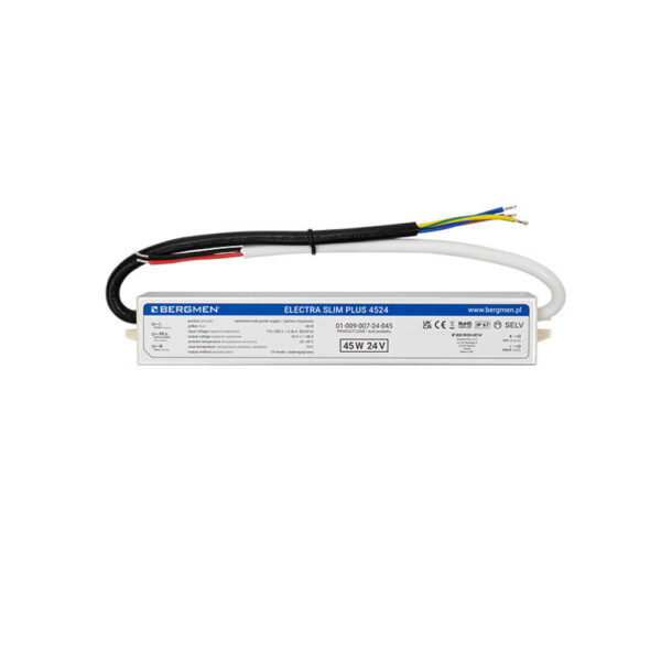 Професионално захранване за LED осветление Bergmen Electra Slim Plus 01-009-007-24-045 e проектирано специално за захранване на нисковолтови 24VDC LED инсталации. Неговите спецификации и функционалност го правят идеален избор за тези, които търсят надежден трансформатор за своите LED осветителни системи. Основните предимства на професионално захранване за LED осветление Bergmen Electra Slim Plus 01-009-007-24-045 са вградените защити, високата степен на херметичност IP67, добра ефективност и стабилна работа при трудни условия.