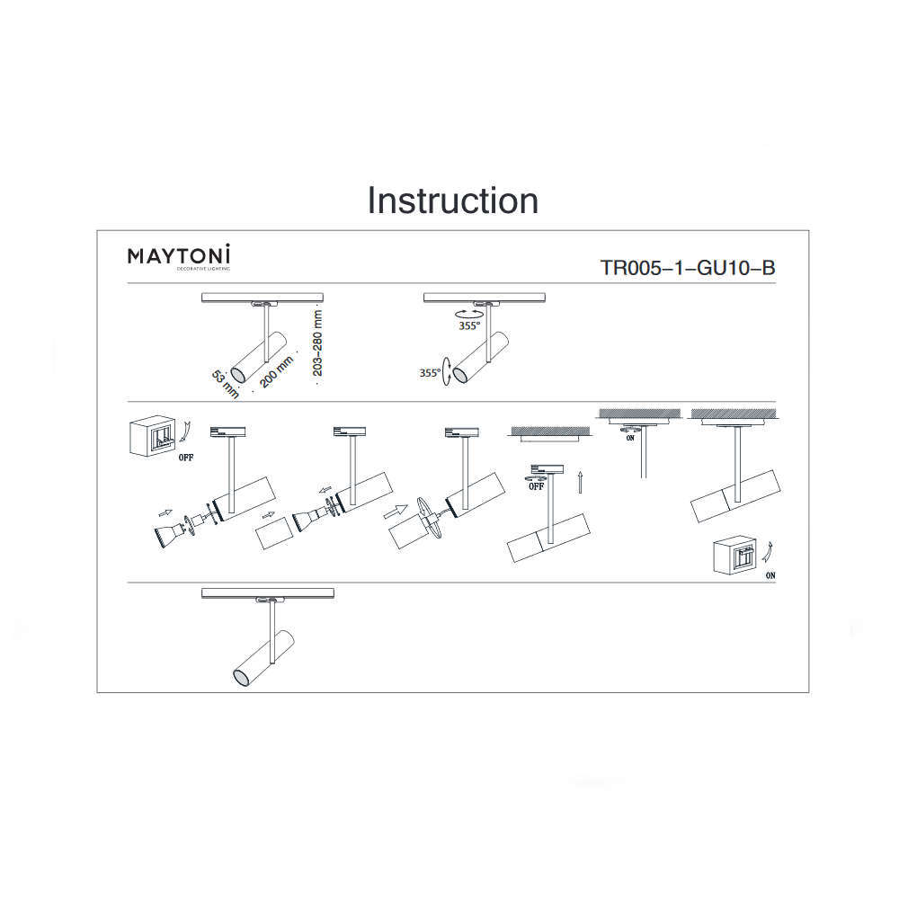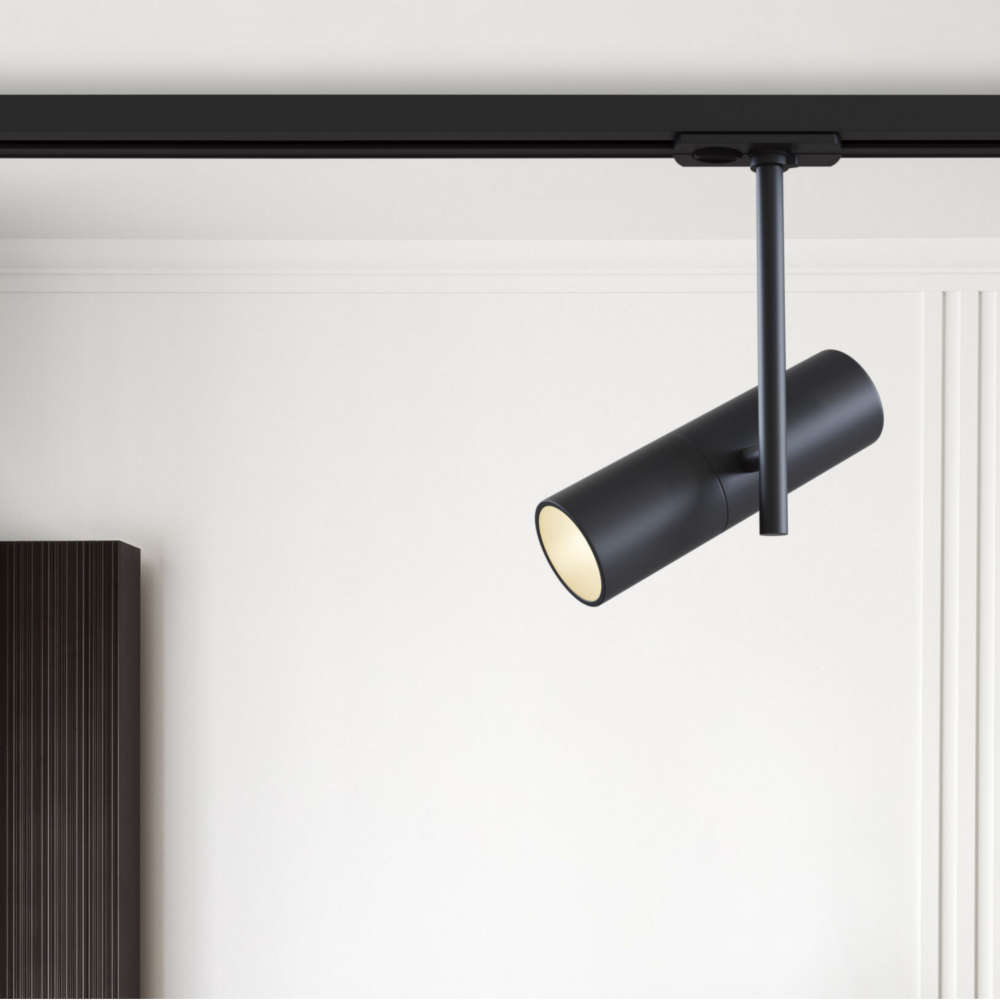 Релсов прожектор Maytoni TR005-1-GU10-B - релсово осветително тяло от висок клас със заменяема лампа GU10. Черен спот за релса с цилиндрично тяло от алуминий в цвят черен мат. Подвижното основно тяло позволява насочване на светлината в подходяща посока. Maytoni TR005-1-GU10-B може да използва LED лампа Gu10 и в правилно съчетание да изгради елегантна релсова осветителна система.