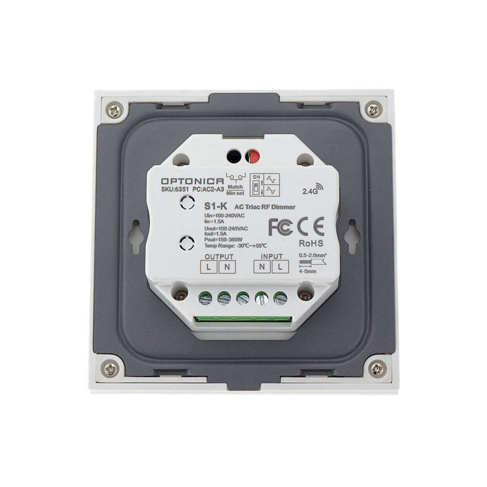 Ротационният димер 220VAC Triac RF 360W max. IP20 OPT 6351 е надеждно решение за плавно регулиране на яркостта на LED осветление и други димируеми източници на светлина. Устройството работи с Triac технология и позволява прецизен контрол чрез въртящ се потенциометър, осигурявайки комфортна и енергийно ефективна светлинна среда. Подходящ е за управление на LED лампи, LED ленти 220V и осветителни тела в жилищни и търговски пространства. Компактният дизайн улеснява вградения му монтаж, а RF управлението гарантира стабилна работа и съвместимост със съвременни системи за LED осветление.