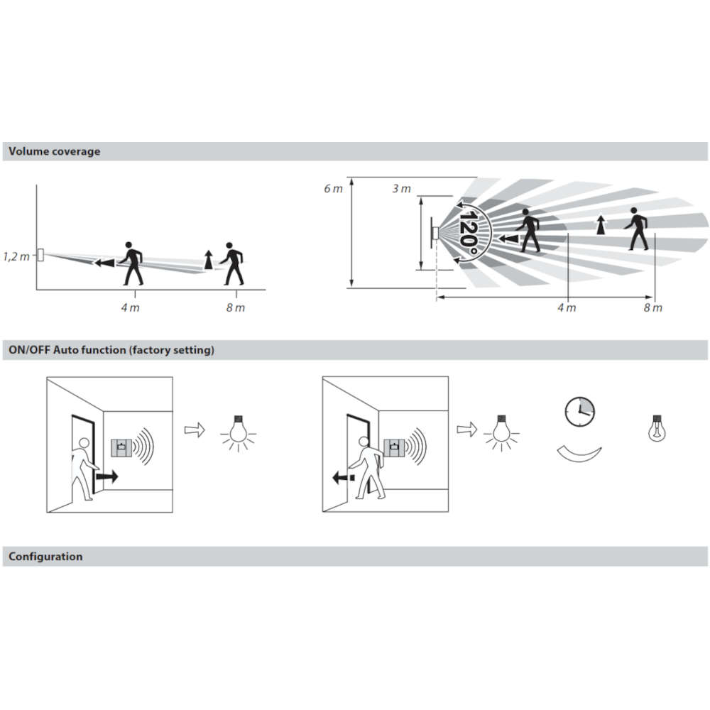 Датчикът разполага с регулируем праг на осветеност, който предотвратява включването на светлината при достатъчно естествено осветление, както и с регулируемо време за изключване в диапазон от 10 секунди до 10 минути.
