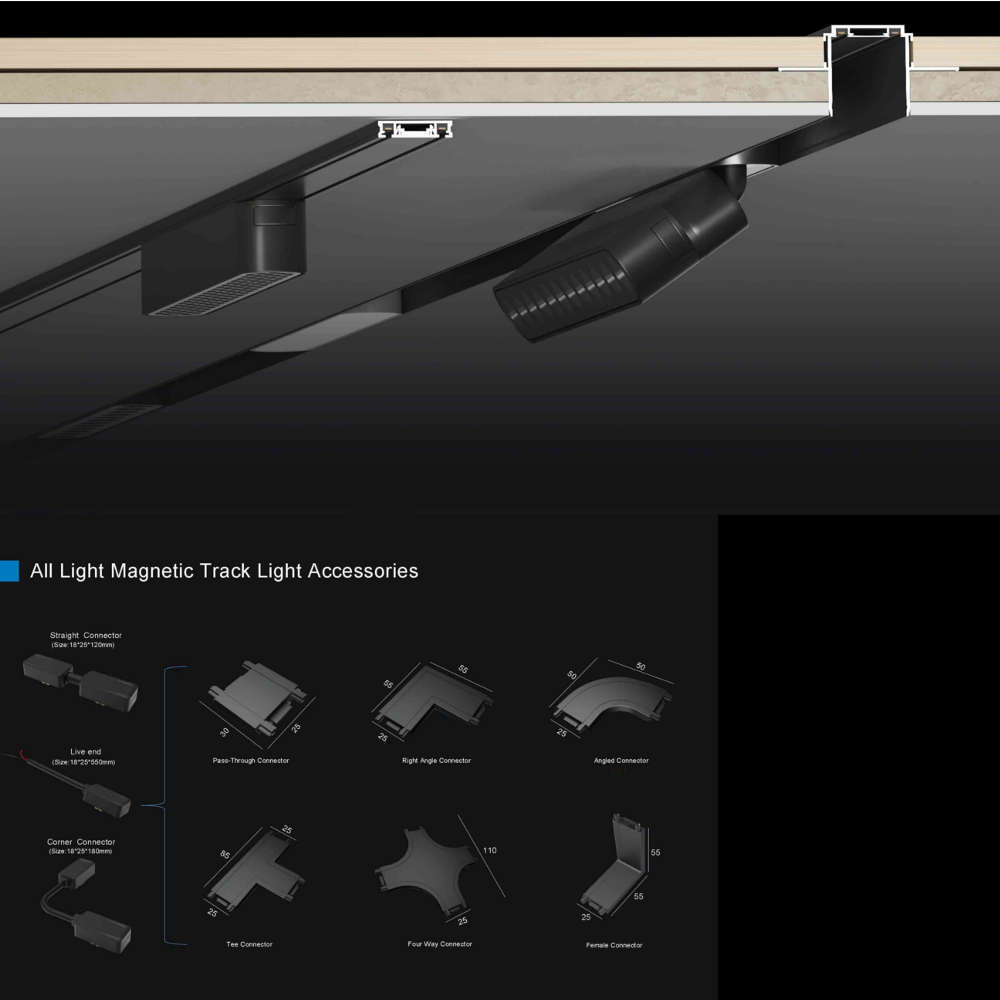 Магнитна релса LVT Luxo 1819 - тази мини магнитна шина ви позволява да комбинирате акцентиращо и основното осветление във всякаква форма. Изработена е от висококачествен алуминий и съдържа 2 проводника за индивидуална или безжична настройка на осветлението. Магнитна релса LVT Luxo 1819 има много възможности за приложение, тъй като размерите и са сведени до минимум, което позволява повърхностно монтирана светлинна инсталация, която изисква само минимално пространство. Независимо дали е в жилищни помещения, хотели или в търговски обекти, различните LED осветителни тела за магнитен монтаж на релсата могат да се използват за основно осветление или декоративно осветление, предлагайки множество начини за гъвкавост. Налични цветове: черен и бял. Крайните тапи и декоративен капак са включени към релсите.