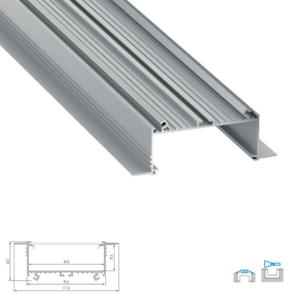 Широк алуминиев профил за вграждане в гипсокартон Lumines Lighting Sorga 10-0534-20 с дължина 2 метра и улей за LED лента 84 мм. Подходящ за мощни LED ленти и професионални линейни осветителни решения. Осигурява равномерна светлинна линия и ефективно охлаждане благодарение на алуминиевата конструкция. Предлага се в анодизиран алуминий, бял и черен цвят. Дифузер и крайни тапи се поръчват отделно за пълна персонализация на проекта.