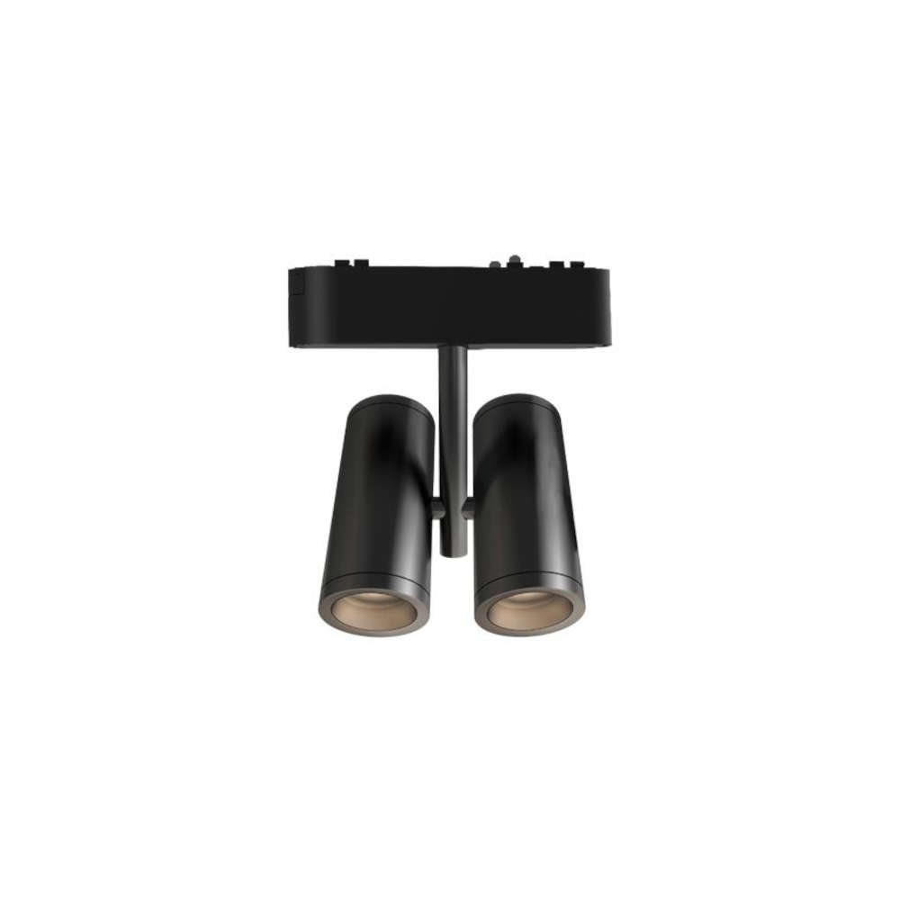 Спот прожектор Ringo Duo LVT Luxo 0406 за 48V мини магнитна система с мощност 2x8W, 4000K и светлинен поток 2x640 lm. Черно двойно тяло с 36° ъгъл на светене за ефективно акцентно или общо осветление. Независимо регулиране на всяко тяло – 175° вертикално и 350° хоризонтално за прецизно насочване.