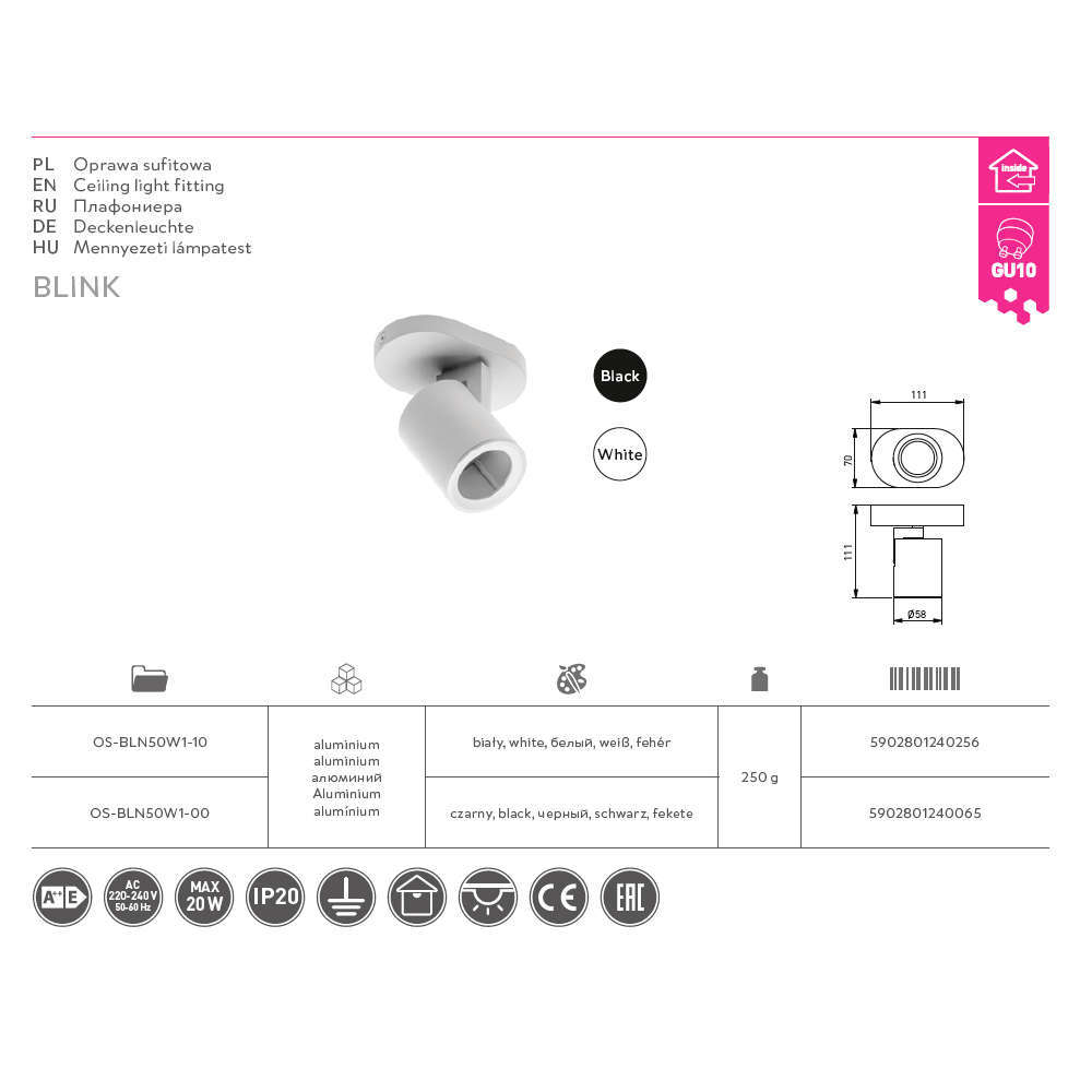 Спот осветително тяло GTV Blink OS-BLN50W1-10- компактно осветително тяло спот подходящо за монтаж на таван или стена. Осветителното тяло е изработено от алуминиева сплав с интегрирана фасунга GU10. Могат да се използват всички 220V лунички GU10 за светлинен източник. Тялото позволява максимално насочване от 90 градуса в желана посока. Спот осветително тяло GTV Blink OS-BLN50W1-10 е боядисано в цвят черен мат. Предлага се без луничка в комплекта.