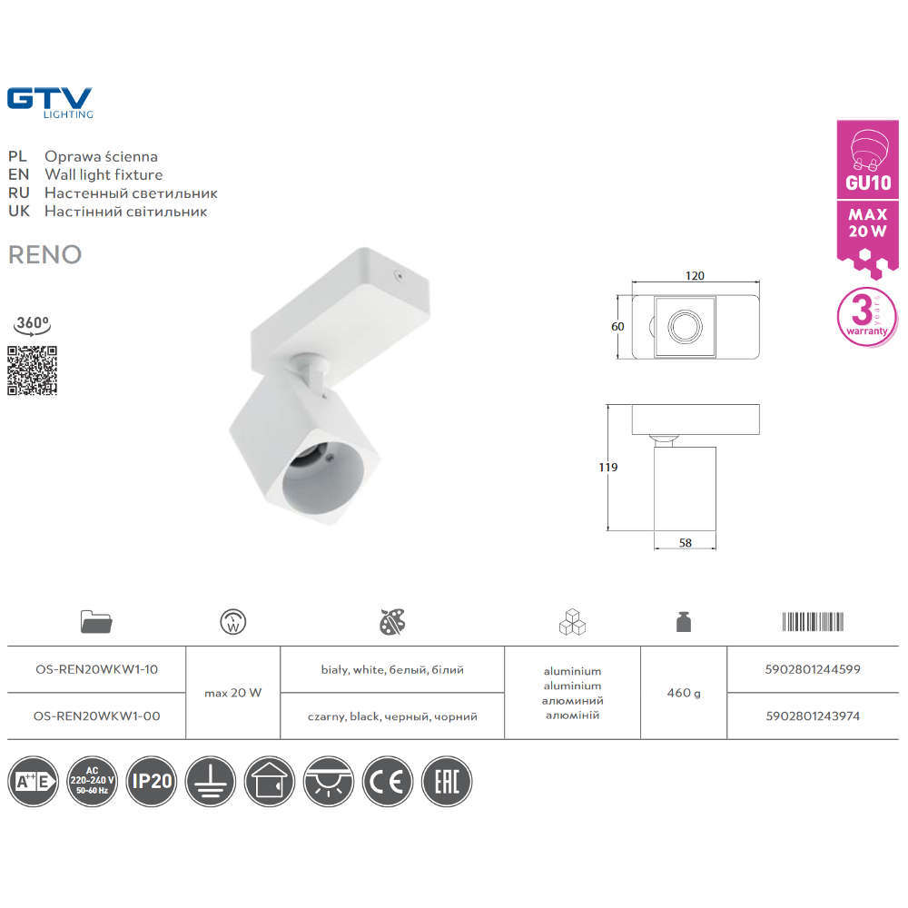 Характеристики на спот тяло GTV RENO OS-REN20WKW1-10: