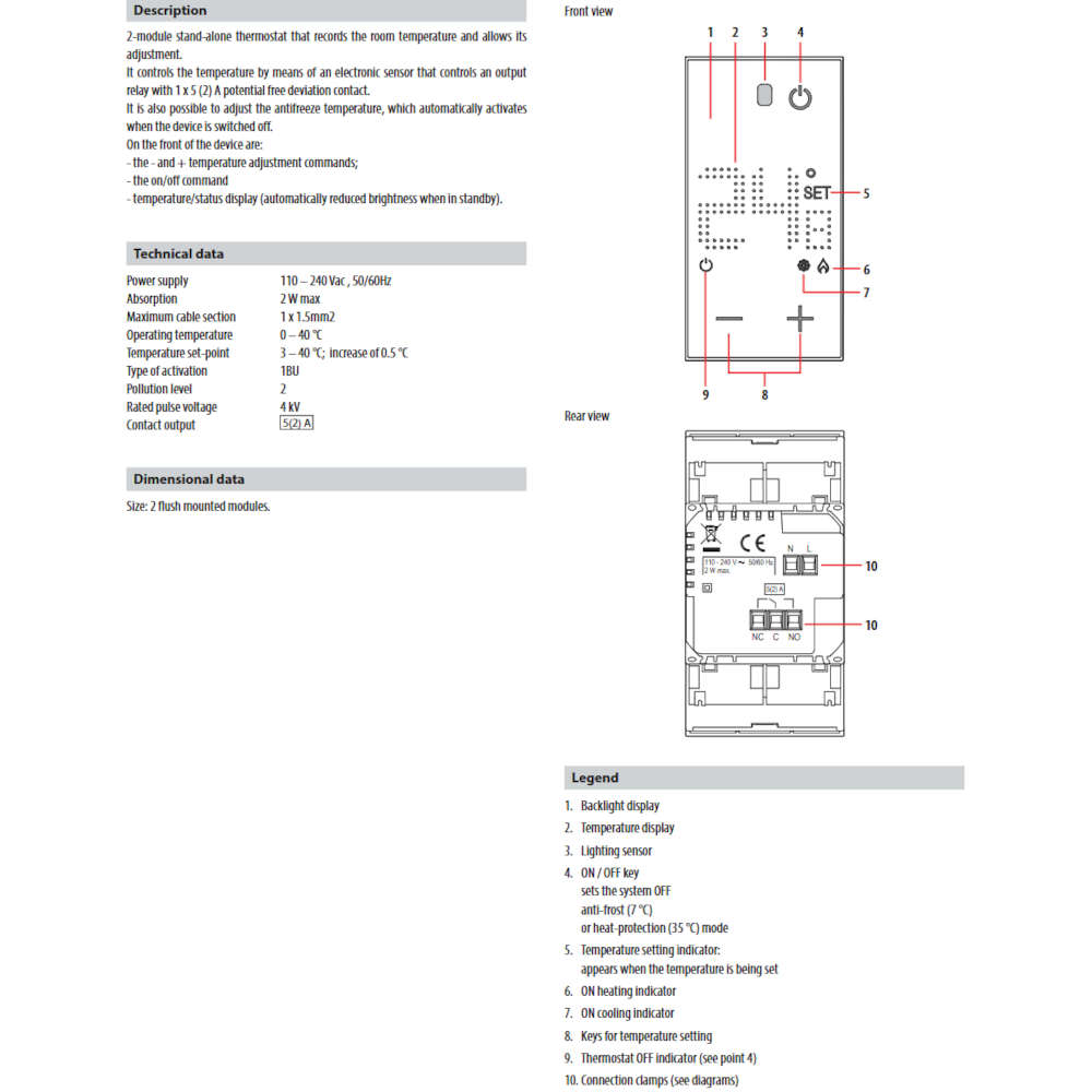 Стайният термостат Bticino Living Now KM4441 е проектиран да осигури надеждно и удобно управление на температурата в жилищни и офис пространства. Благодарение на безпотенциалния релеен изход (5A), устройството може да се използва с разнообразни системи – от класически отоплителни инсталации до съвременни решения като термопомпи и електрическо подово отопление.