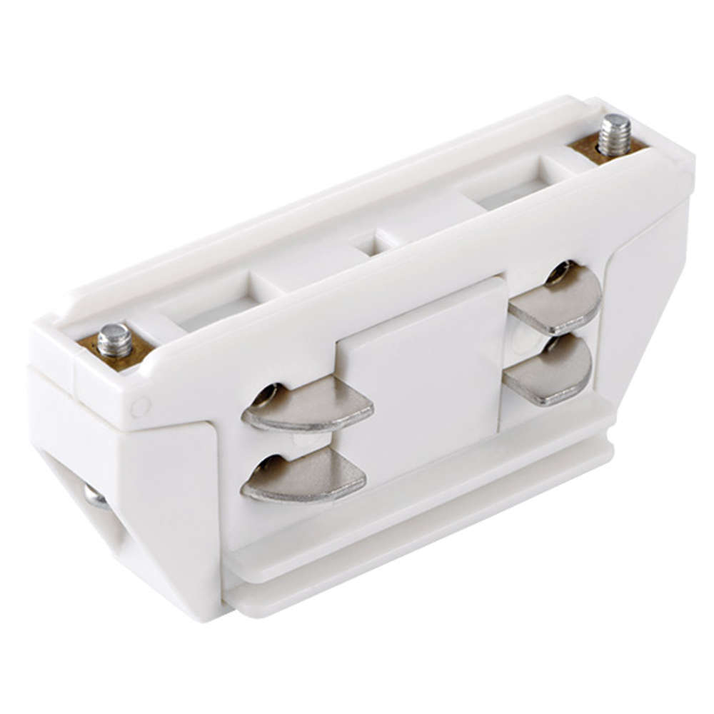 Свързващ конектор за тоководеща релса за интериорни прожектори Kanlux 22586 - свръзка за четирипроводна шина за релсови прожектори и релсови светителни тела. Бяла наставка за релси 1 и 2 метра.
