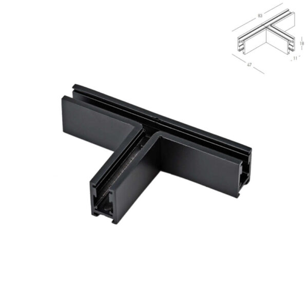T-конектор Zambelis 2514 в черен мат за магнитни шини 5mm е идеален за изграждане на ултратънки магнитни системи. Позволява лесно T-свързване на три сегмента релси и е съвместим с всички компоненти Zambelis SURFACE MAGNETIC TRACK 5MM. Подходящ е за повърхностен и окачен монтаж, осигурява надеждност и функционалност, като позволява естетично и модерно решение за интериорно осветление.
