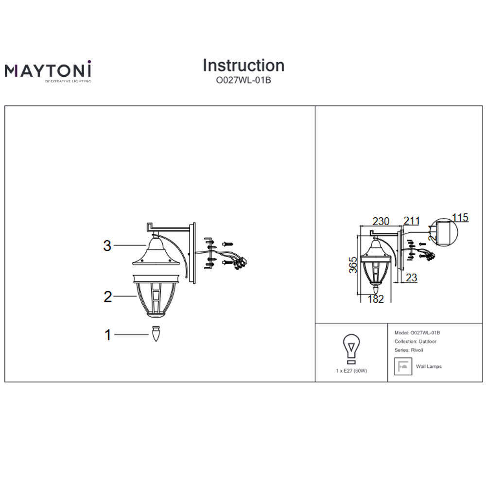 Външно осветително тяло фасаден аплик Maytoni Rivoli O027WL-01B - елегантен фасаден аплик с корпус от алуминий, художествена отливка. Цвят на корпуса - черен. Стъклен абажур с декоративни метални пластини. Защита от корозия и температурни крайности IP44. Източник на светлина - лампи с основа Е27.