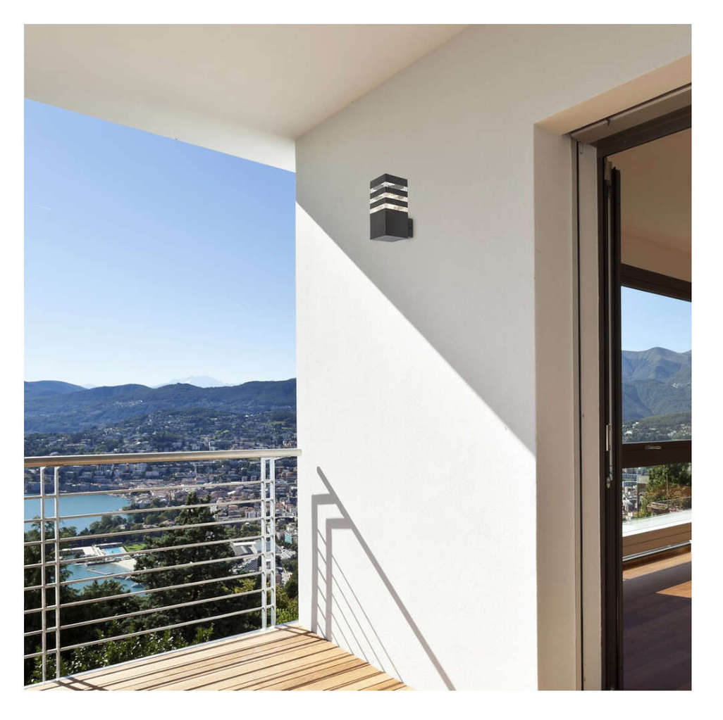 Външно осветително тяло за стена Ankara Rabalux 7379 - модерна стенна лампа създавща видимост през нощта и атмосфера на открито. Може да се монтира на стена на тераса, веранда или ограда или по избор в градината и двора. Дизайнът на тази лампа се съчетава добре с други външни лампи от серията Ankara Rabalux. Осветителното тяло е изработено от висококачествен алуминий и притежава клас на защита IP44 - устойчив на пръски, влага и прах. Външно осветително тяло за стена Ankara Rabalux 7379 е с ширина 9 см, дълбочина 12,5 см и височина 20 см и се доставя без крушка, която трябва да закупите отделно.