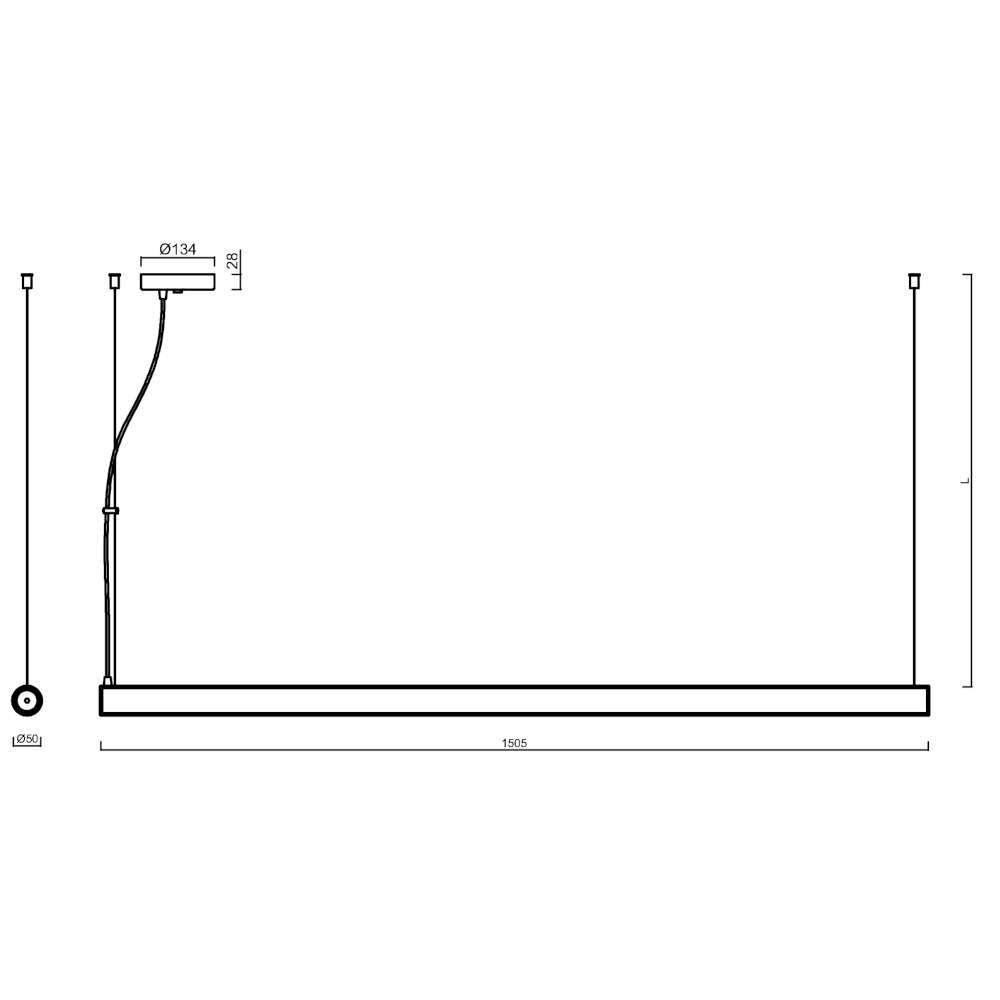 Корпусът е изработен от метал с висококачествено бяло покритие, а дифузерът от PMMA гарантира равномерно разпределение на светлината и минимизира заслепяването. Цилиндричната форма с диаметър 50 mm и дължина 1505 mm подчертава модерния и елегантен характер на осветителното тяло.