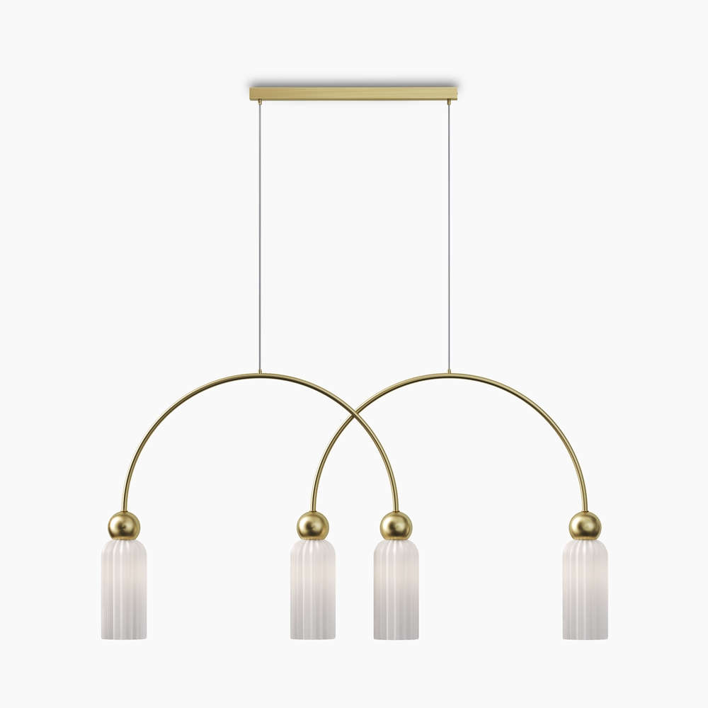 При този модел абажурите са цилиндрични с височина 225 мм и диаметър Ø100 мм. В горната си част се заоблят плавно и завършват със златист сферичен детайл. За разлика от единичните пендели в серията, тук формата остава изчистен цилиндър без разширяване в долната част, което придава по-строг и елегантен силует.