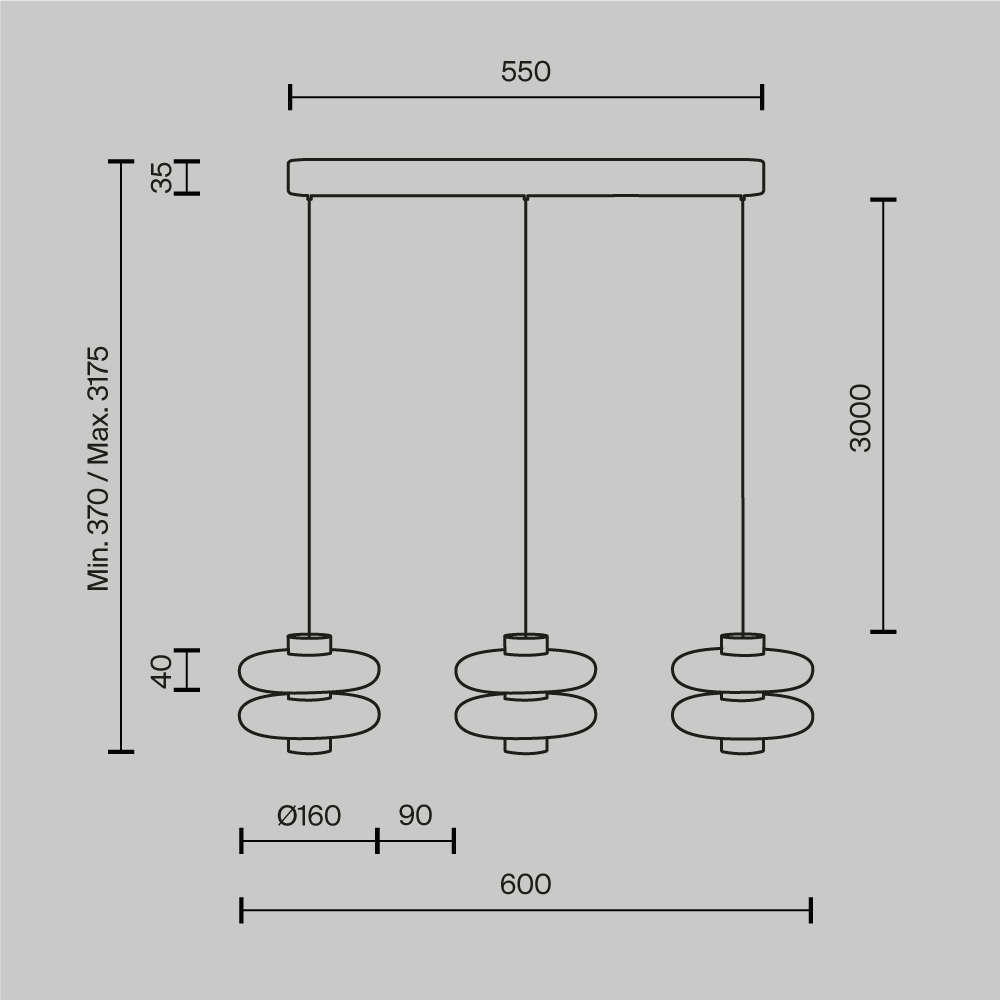 - с три висящи тела с диаметър Ø160 мм