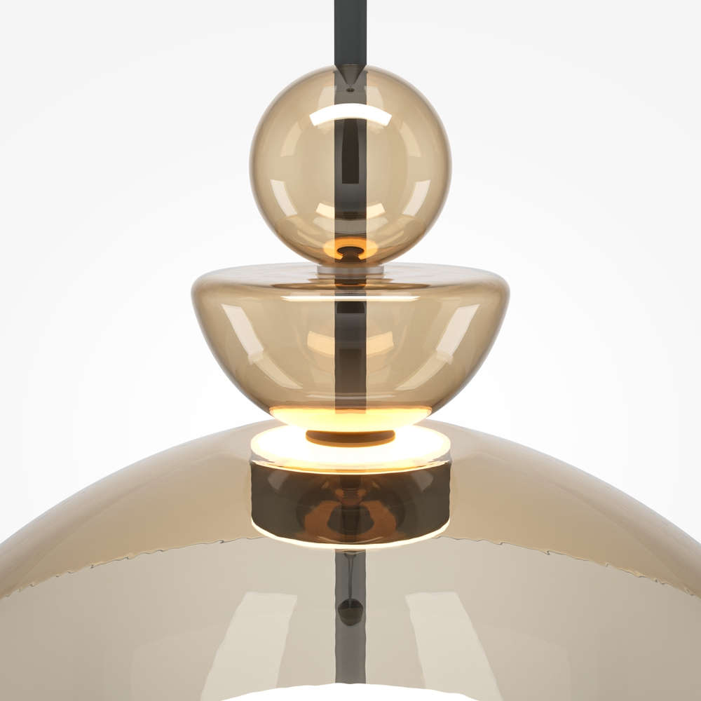 Дизайнерска висяща LED лампа Maytoni MOD185PL-L12CG3K3 от серия Bangkok със куполовиден стъклен абажур Ø40 см и два стъклени елемента над него с форма на полусфера и сфера цвят коняк, създаваща топъл златист светлинен ефект със светенето си нагоре и надолу.