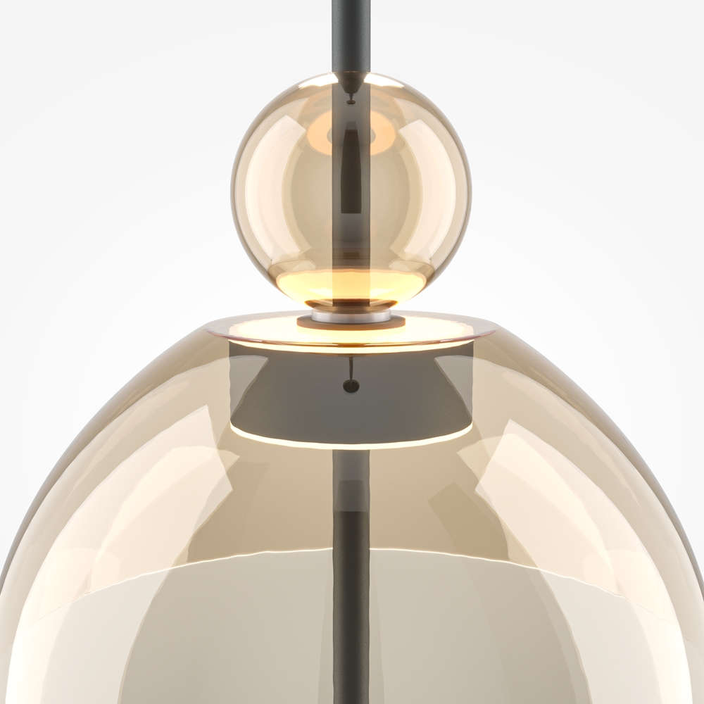 Дизайнерска висяща LED лампа Maytoni MOD185PL-L12CG3K1 от серия Bangkok с конячно стъклен купол и стъклена сфера, създаваща топло златисто сияние и характерния „храмов“ силует.