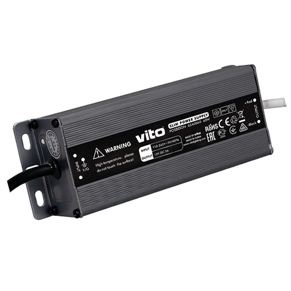 LED захранване VITO POSEIDON SLIM 60W за LED ленти, LED крушки, лунички и модули с максимална консумация 60W. Трансформаторът е с изцяло влагозащитен дизайн (степен на защита IP67) за инсталации в суха и влажна среда на закрито. Захранването осигурява напрежение 12V DC и предлага защита от претоварване, късо съединение и прегряване. Алуминиевото тяло е с с размери 216х48х43 мм и се вгражда удобно в окачени тавани.
