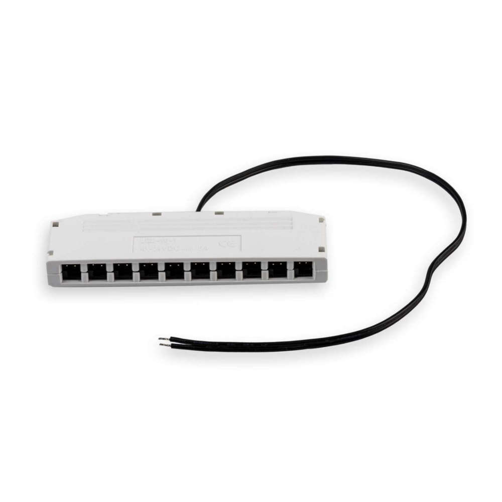 Mini AMP разпределител с 10 порта, който се използва за бързо свързване (без запояване) на LED стълбищни осветителни тела, мебелни LED осветителни тела, клипсове или трансформатори за мебелно осветление.