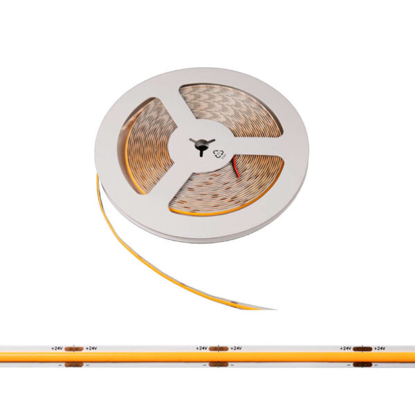 Жълта COB LED лента Bergmen 24VDC, 10W/м, ширина 8 мм, 480 диода/м, рязане на всеки 50 мм. Димируема, ъгъл 180°, IP20 защита, ролка 10 м. Осигурява равномерна жълта светлина за декоративно, ефектно и акцентно осветление в интериора.